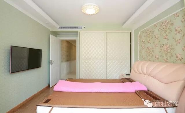 ▲淡绿色的房间、奶白的软包移门、让室内空间耳目一新