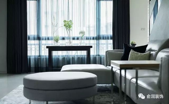 考虑质感与视感相一致,轻薄的飘窗设计和深色的窗帘形成良好的过渡,灰色的皮质沙发,布艺设计的座椅,窗前那一抹绿,为整个客厅增添了一份生机和活力。