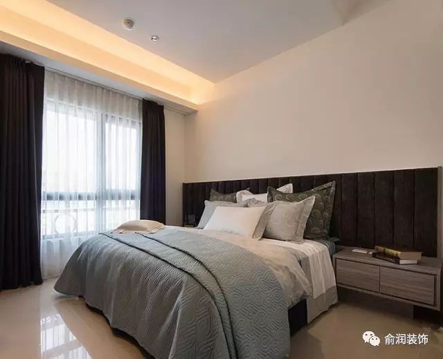 和客厅一样的窗帘设计,使整个空间在整体布局上高度一致,避免了色彩的混乱。酒店式的设定,嵌入式的壁柜,让人在感官上瞬间喜欢上这个卧室。