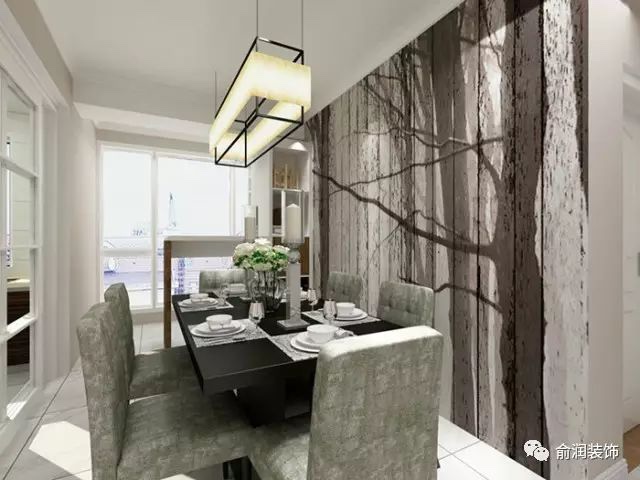 运用干净整洁的大色调,灰色的餐椅和淡黄的吊灯设计,使整个餐厅简单而又不会感觉到凌乱。不规则的背景墙让整个餐厅生动、有趣,让置身于家中的人充满了浪漫和温馨感。