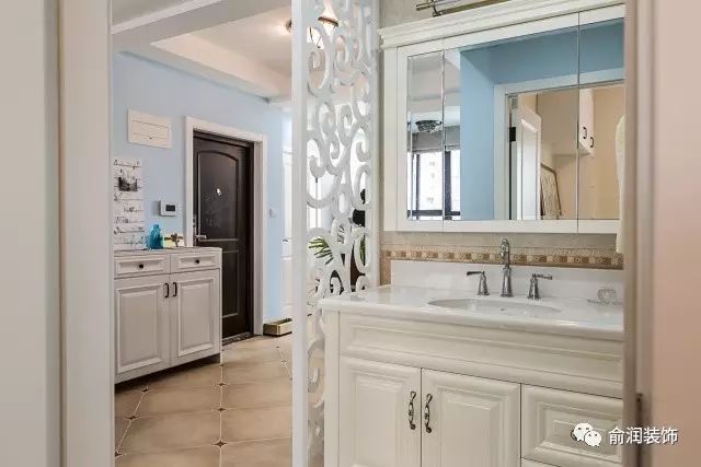 次卫设计干湿分离,淋浴,干区设计了雕花隔断屏风,不仅造型美观,而且镂空的通风效果也是杠杠的,访客多的的时候也不用担心卫生间不够用拉。