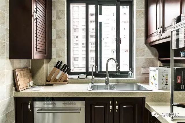 中厨选用灰色系美式复古小砖搭配深色美式橱柜,厨房油烟打扫问题一直是一个比较头疼的问题,最终选用玻璃油烟隔离罩,一玻璃易擦洗,二是隔断了很多的油烟外散。地柜嵌入消毒柜,上柜下延伸设计隔板,将调味品放入,既美观,又节约了很多的台面操作使用空间。厨房整体的色调也显出主人稳重的个性。