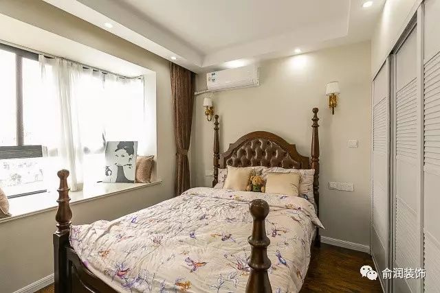 主卧床业主选择的是美式经典罗马柱床,代表性的美式风格。光面型的柱在建筑上给人一种很明朗,大气的感觉,显得落落大方。飘窗上放置抱枕,闲暇之余午后铺上毯子,沐浴着暖阳,看一本书,听一首歌,好不悠哉。