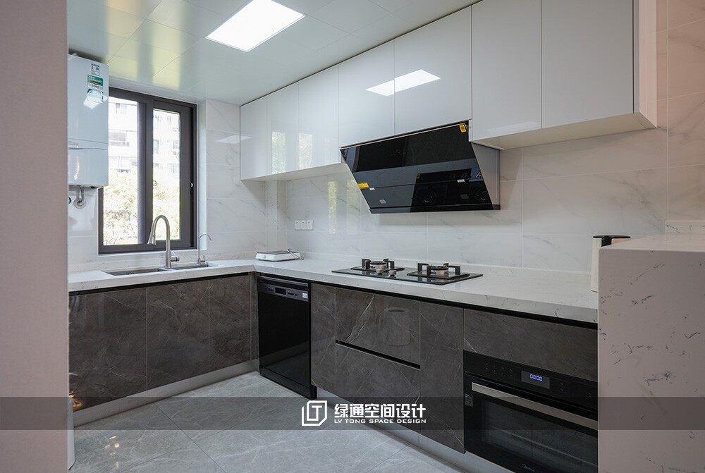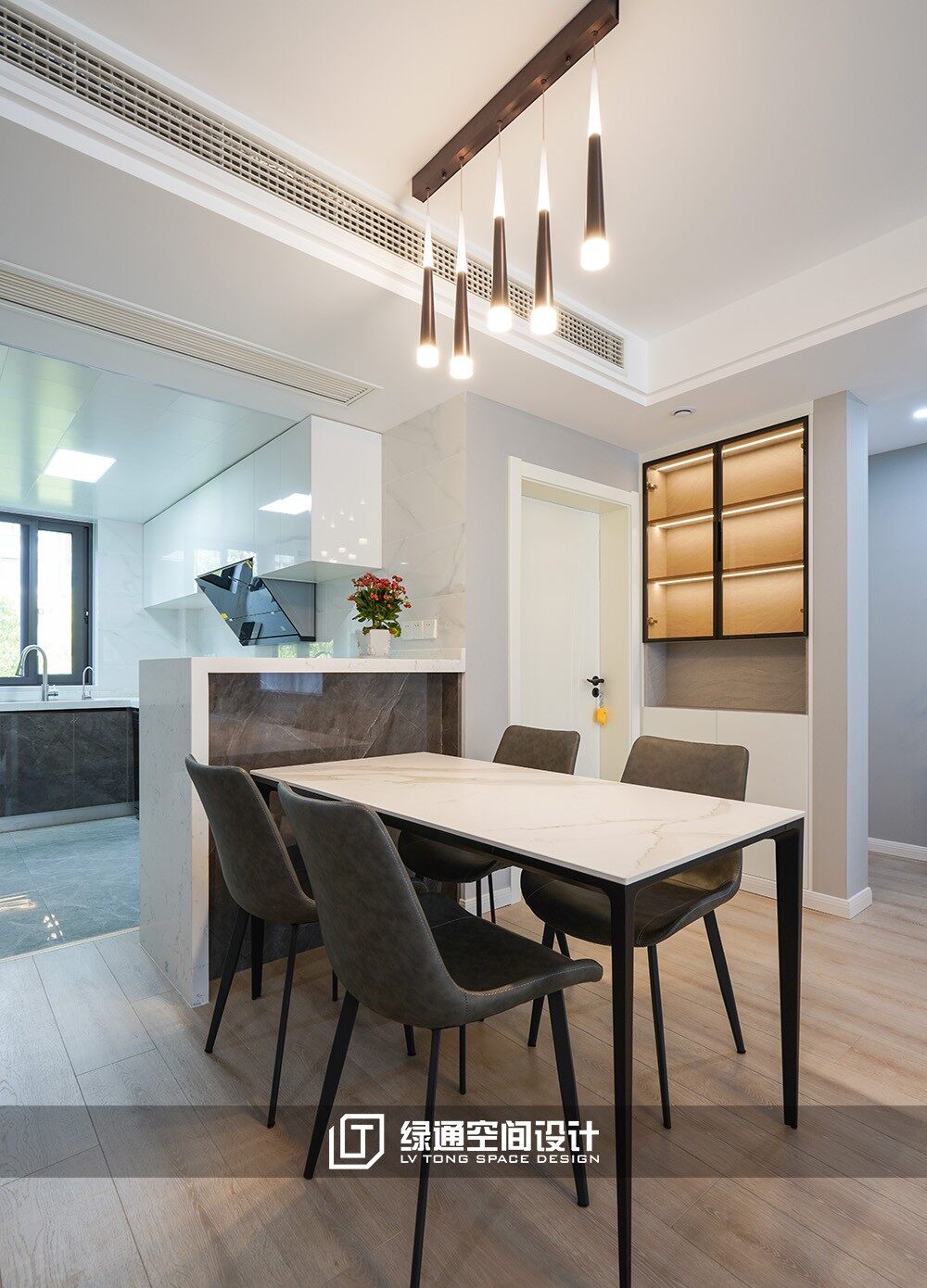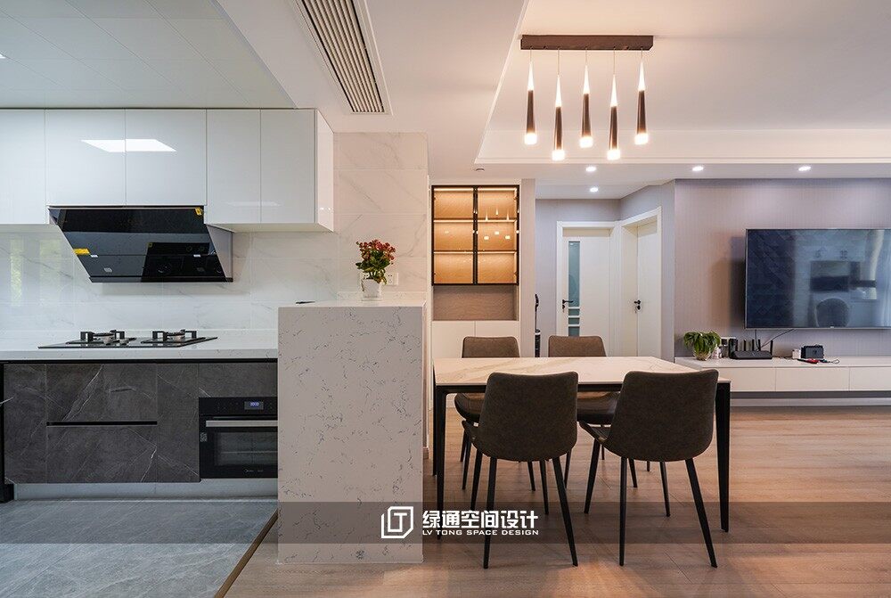 餐厅:餐厅采用吧台式设计,吃早餐很方便,切水果等问题也迎刃而解。敞开式厨房白色瓷砖,爱格板门板装饰,便于清理,也显干净整齐。餐桌旁边酒柜装饰,增添餐厅的功能需求。