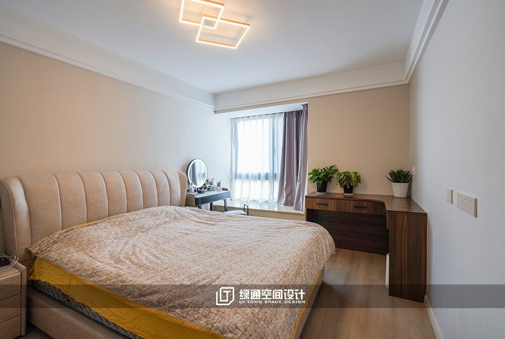 主卧:墙面采用咖啡色墙体,转角式写字台,一是为了增加卧室温馨的氛围, 二是更好的为主人办公提供生活便利。吊顶采用当下流行的双眼皮式走边,简单耐看。