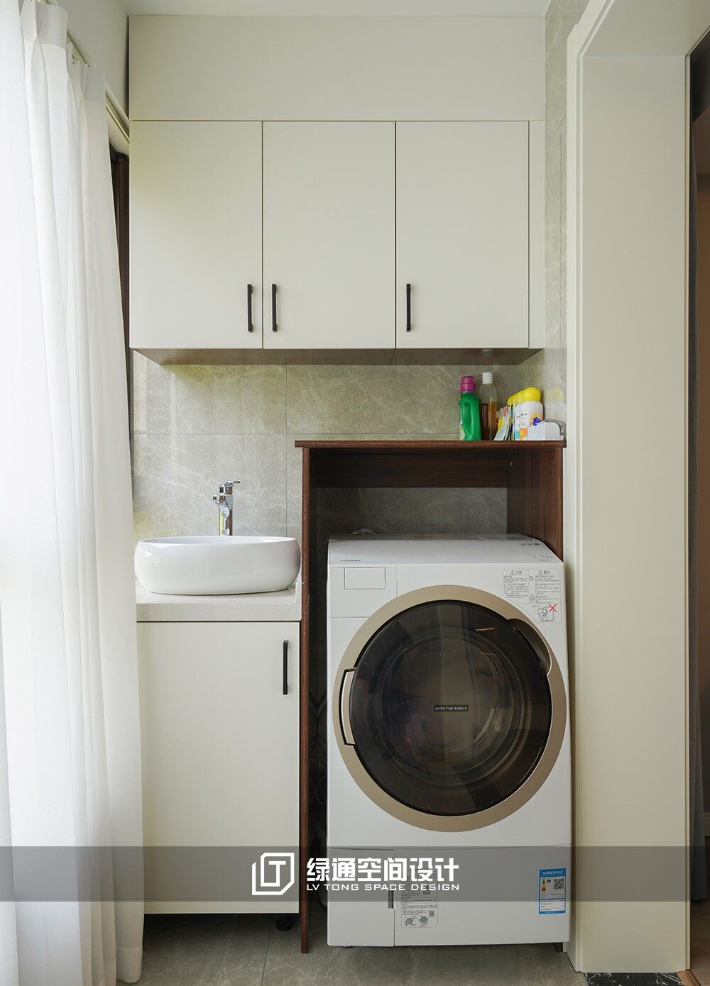 阳台:洗烘一体式设计,是现代生活的一个必然,毕竟天气原因,偶尔会有部分衣物靠烘干和杀菌来维护衣物的质感,墙面白色瓷砖简单,透亮,让整个阳台更显大气。