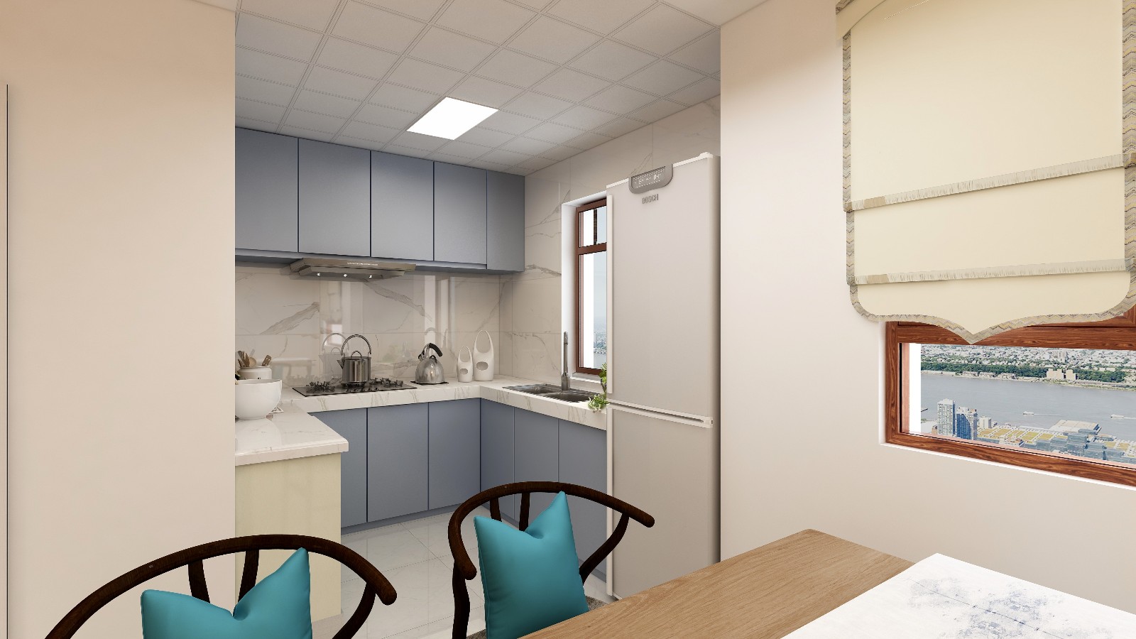 该房子是一对中年夫妻跟父母一起居住,有一定阅历的业主喜欢沉稳端庄而又儒雅气质的新中式。整体的室内设计,以相对轻浅的原木色为主色调,传统纯净的白色做背景色,再辅之以水墨之黑、天之蓝作为点缀色,打造出了一个儒雅韵味的新中式空间。