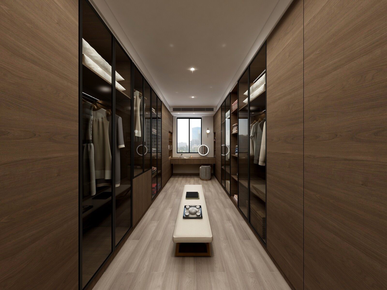 衣帽间采用黑色框玻璃门与木门的完美结合,内嵌灯带,打造舒适与实用的衣帽空间。