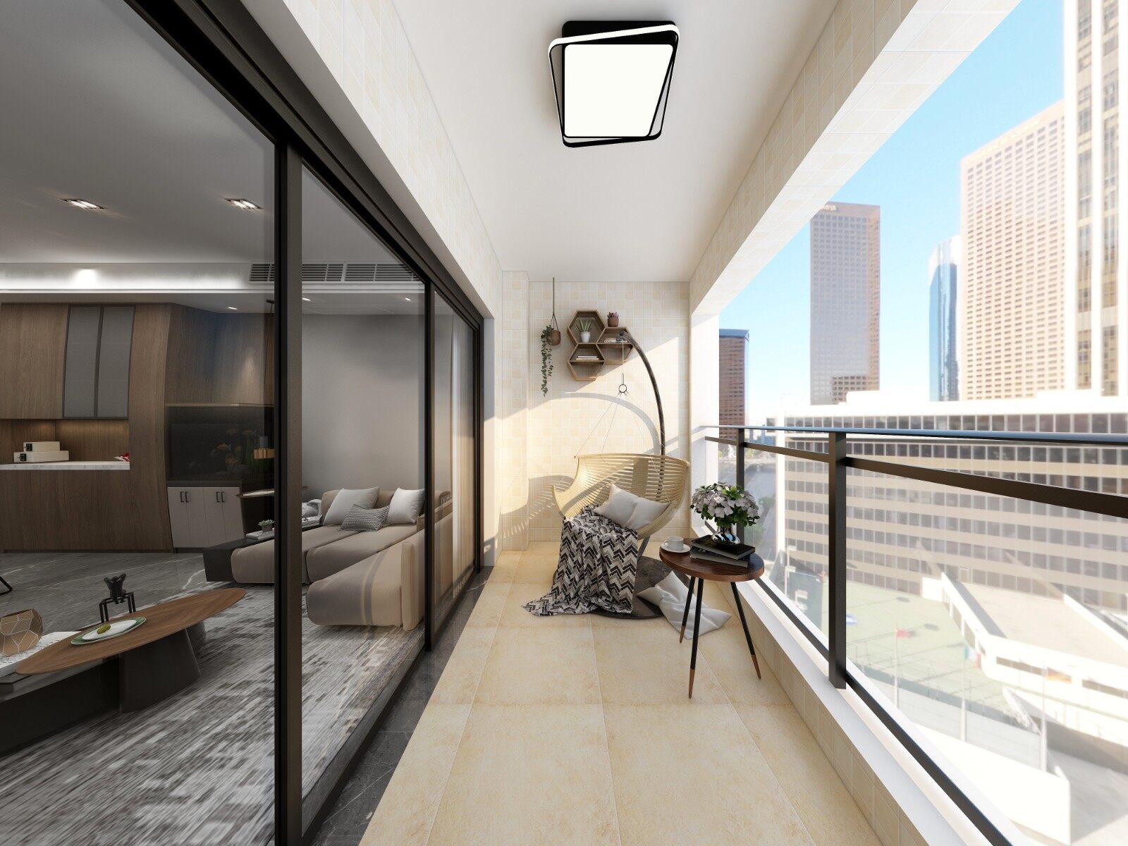 阳台保留原始墙面地面复古地砖,不密封阳台,打造舒适的休闲空间。