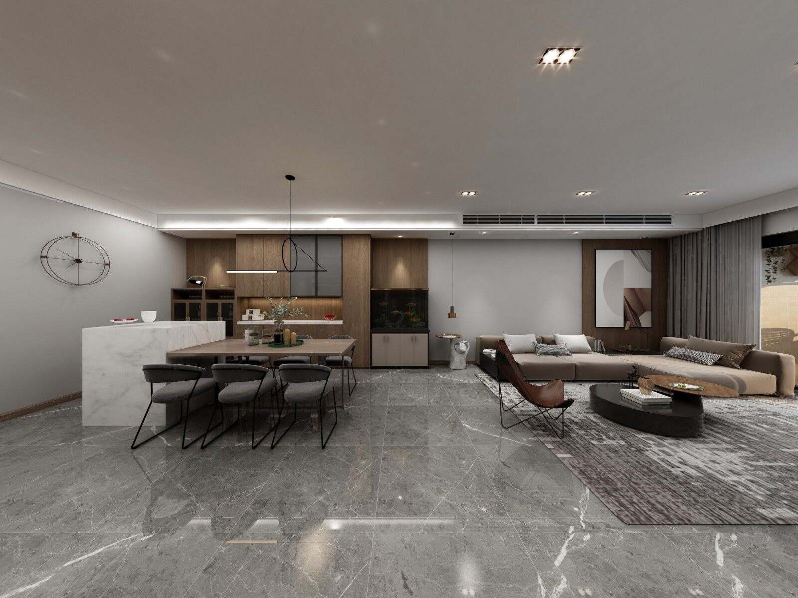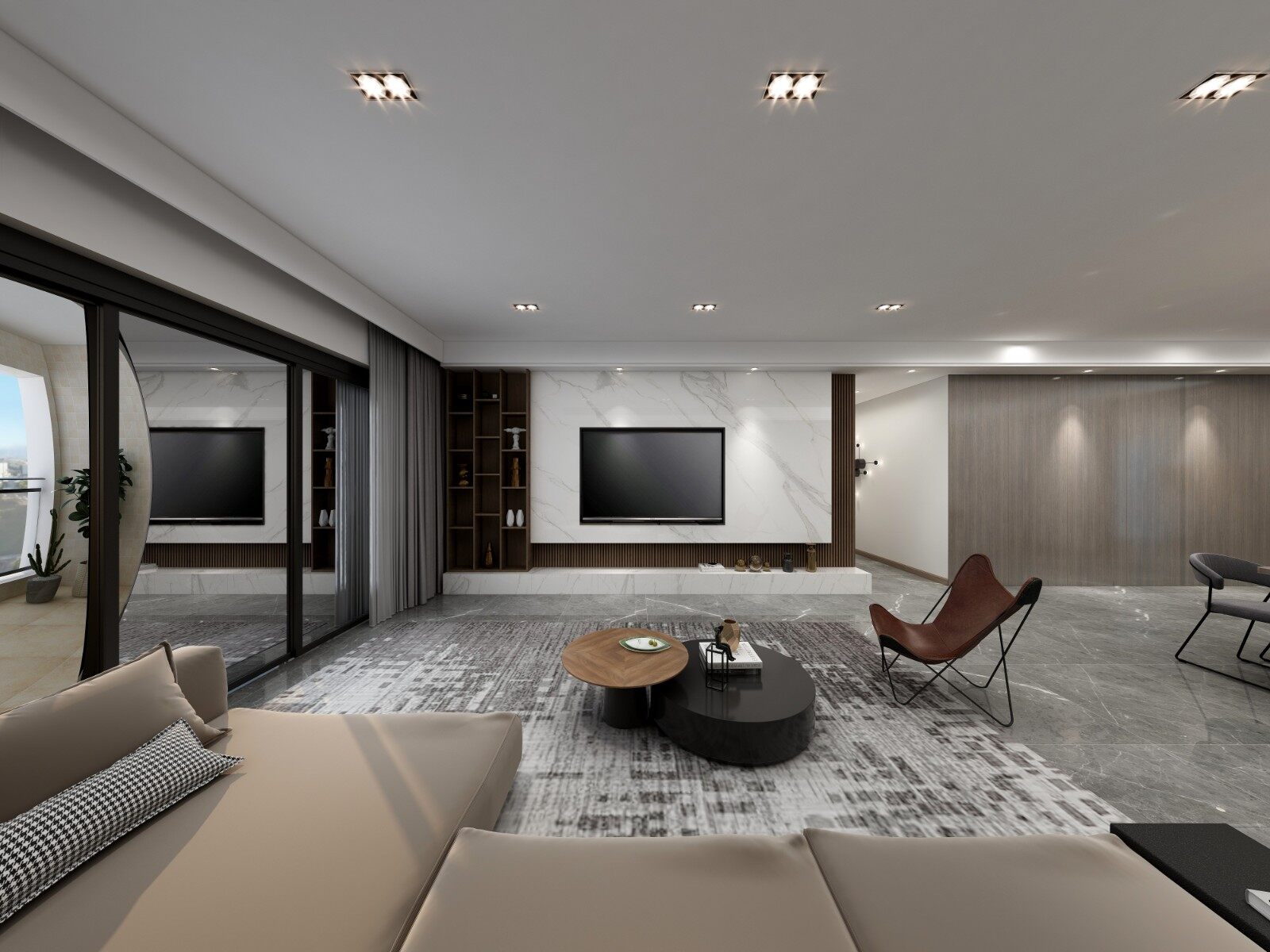 客厅电视背景墙墙大板砖与木饰面的完美结合,装饰立柜设计,美观与实用兼得。
