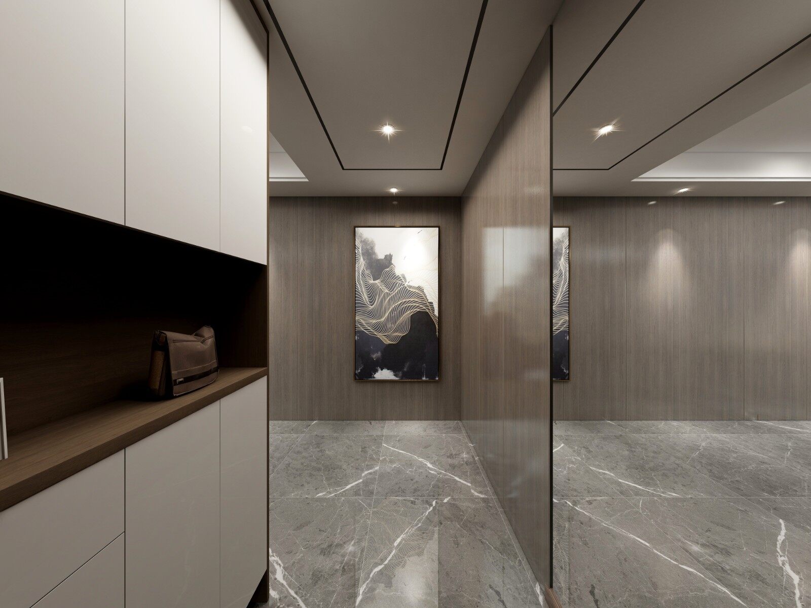 进门玄关去掉多余的设计造型,用最简单的艺术画与简洁的木饰面结合,简约而不简单。