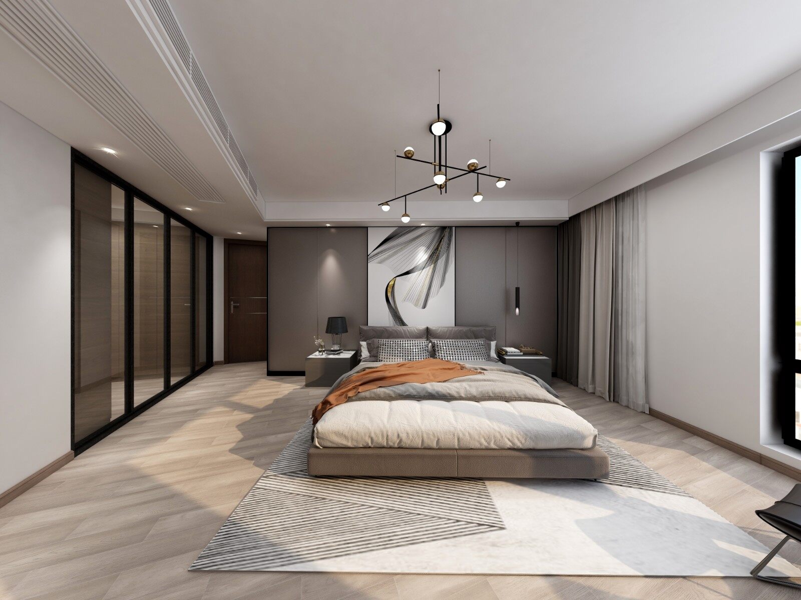 主卧背景墙采用灰色硬包设计,白色墙面,打造简单的黑白灰色调。