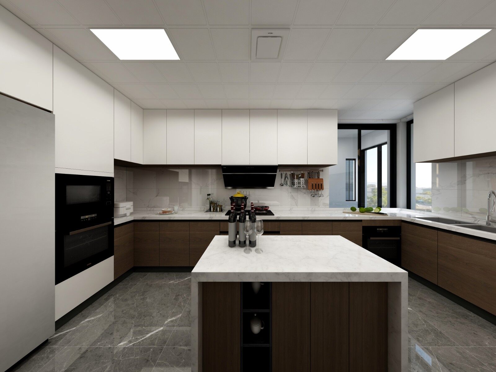 厨房深色地柜与白色吊柜的结合,以及岛台的设计,让整个空间合理利用。