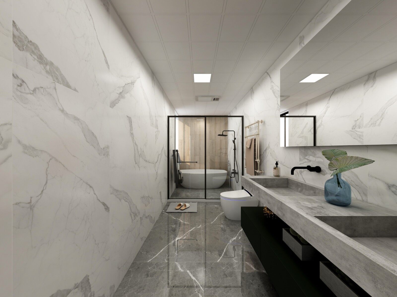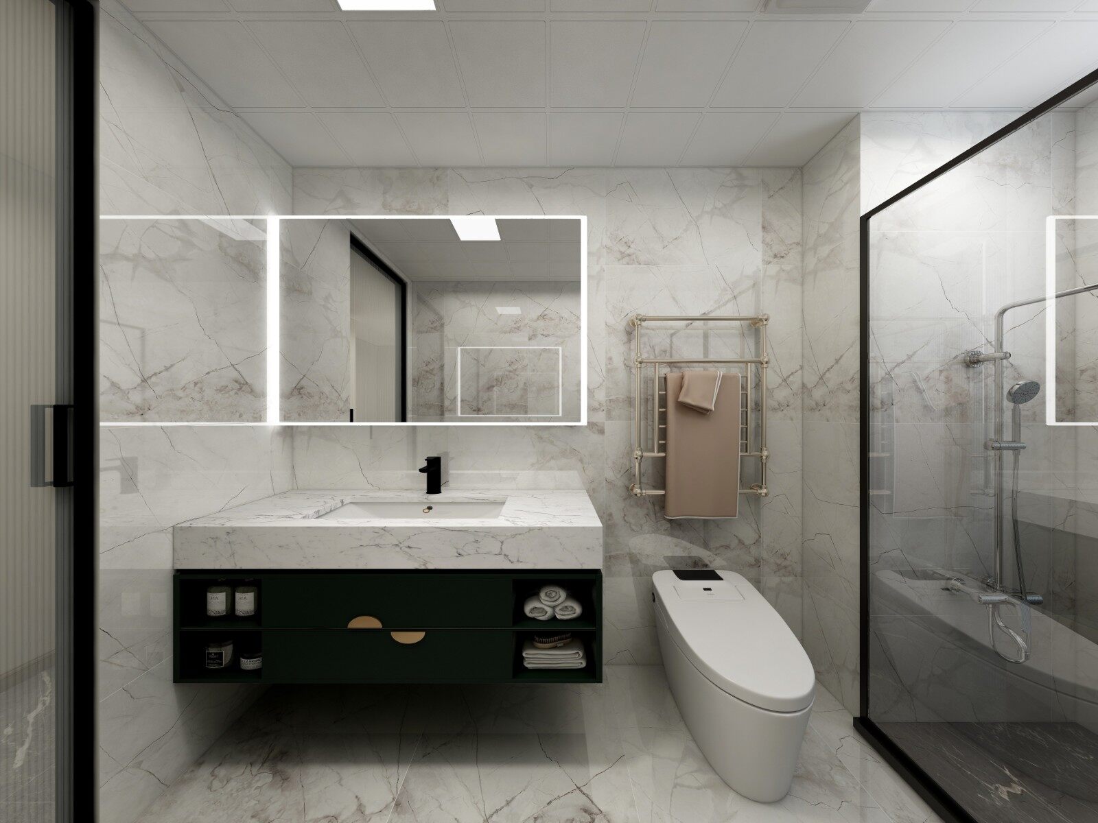 次卫大砖上墙,结合黑色台盆柜以及淋浴房,营造大气洗浴空间。