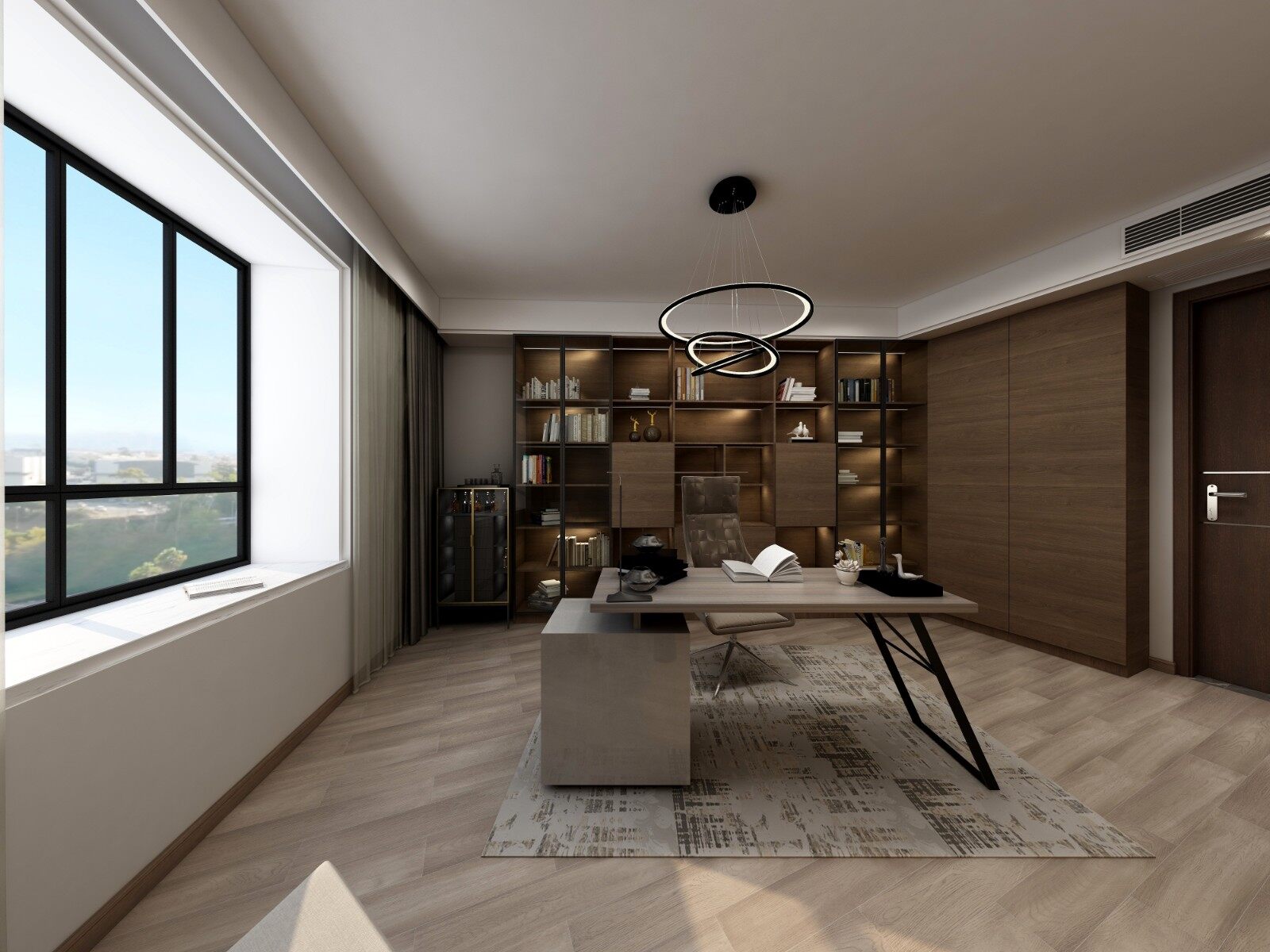 正面书柜与成品大气书桌,打造大气不失书香气的阅读办公区域。