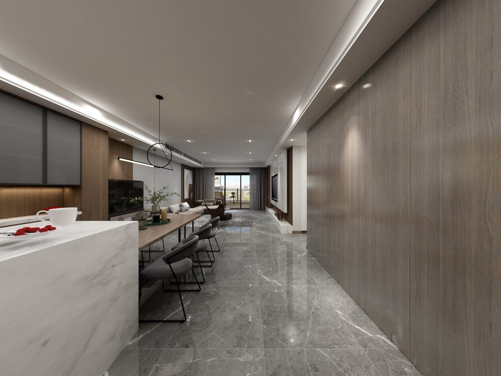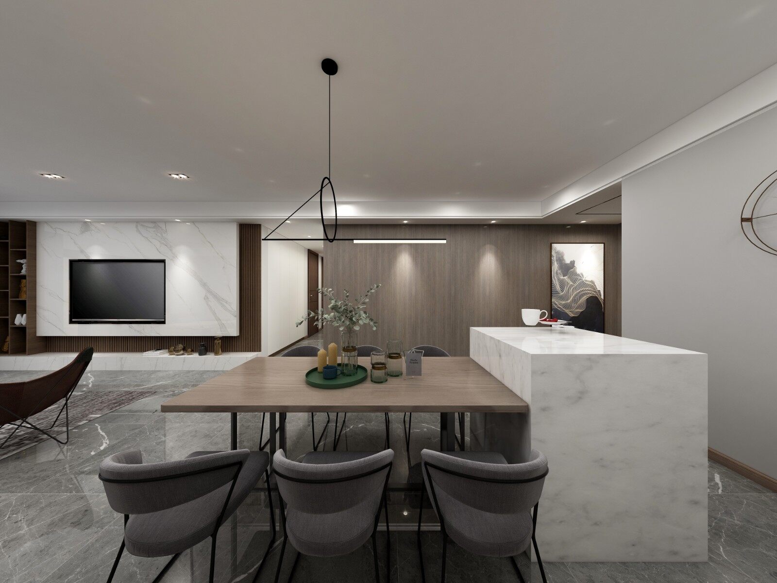 木质的餐桌与大理石岛台完美结合,大气不失优雅。