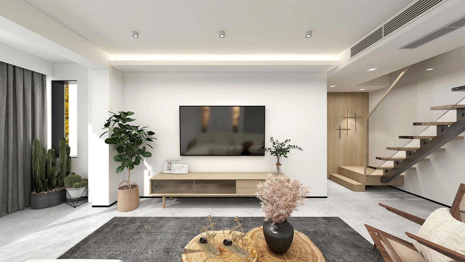 客厅柔和的灯带与无主灯设计,打造简洁的休闲空间。