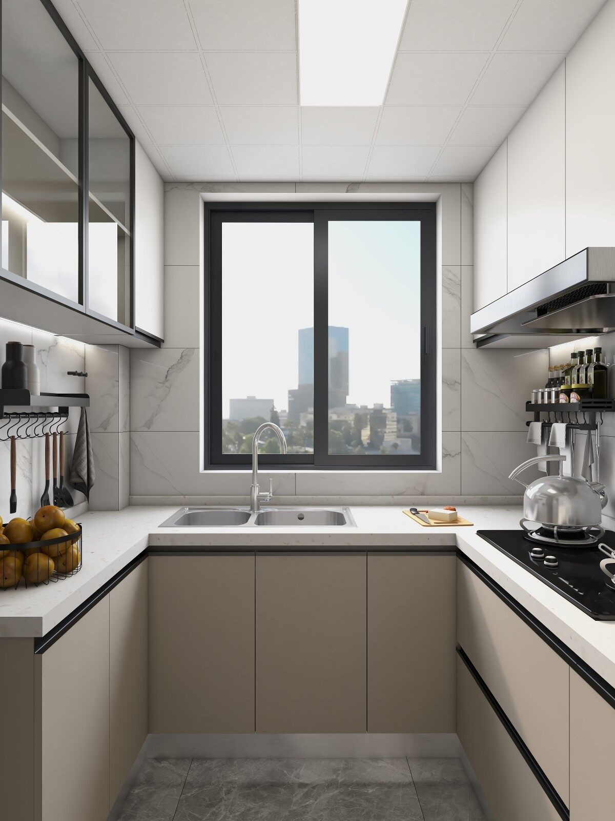 厨房往房间扩了一点,这样冰箱可能放入厨房。U型台面也更加合理,节省做饭时间。