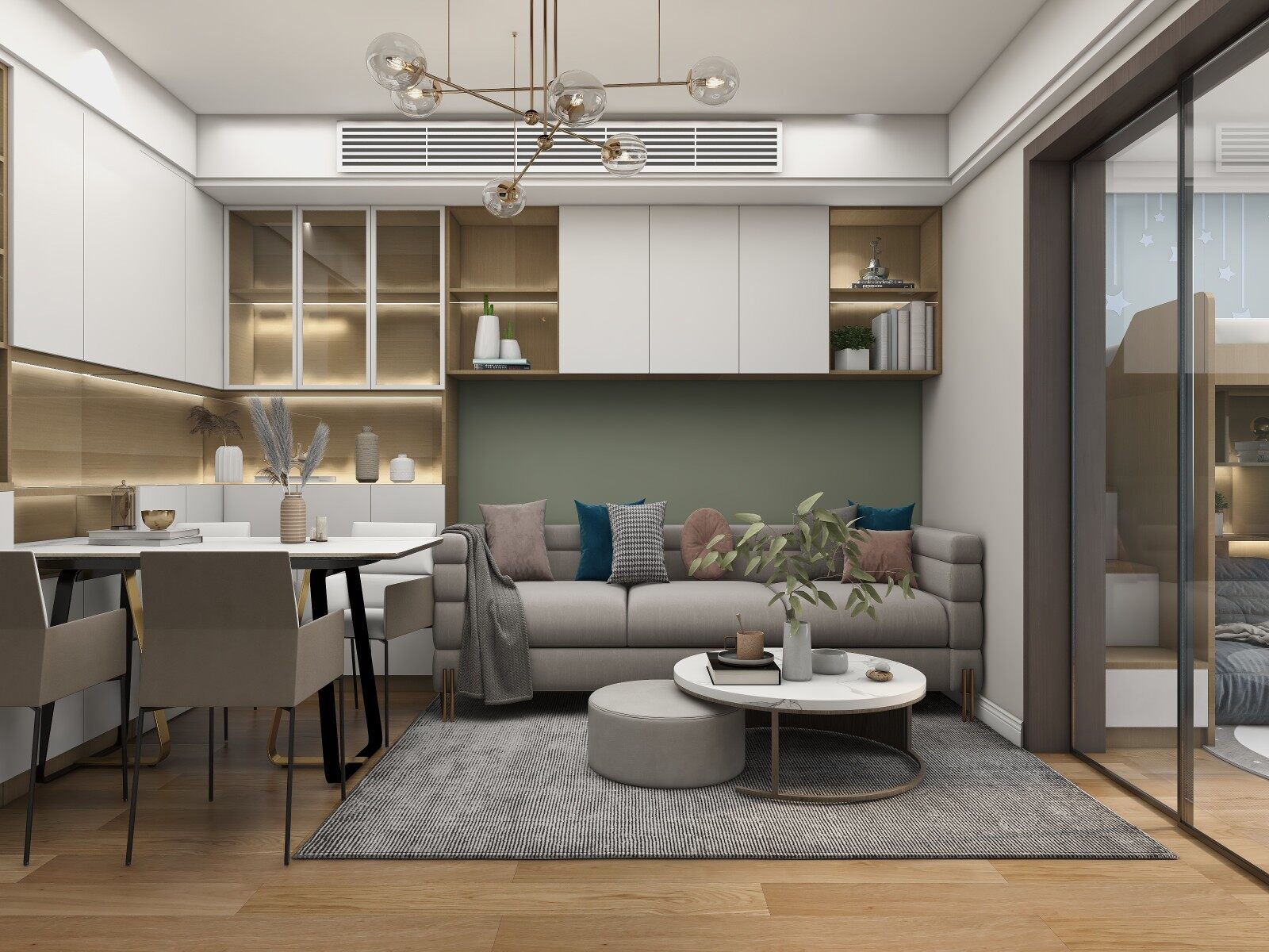 客餐厅一体,视野更开阔。客餐厅增加储物空间,使用了投影幕。餐桌边上加了餐边柜。让餐厅使用功能更加合理。