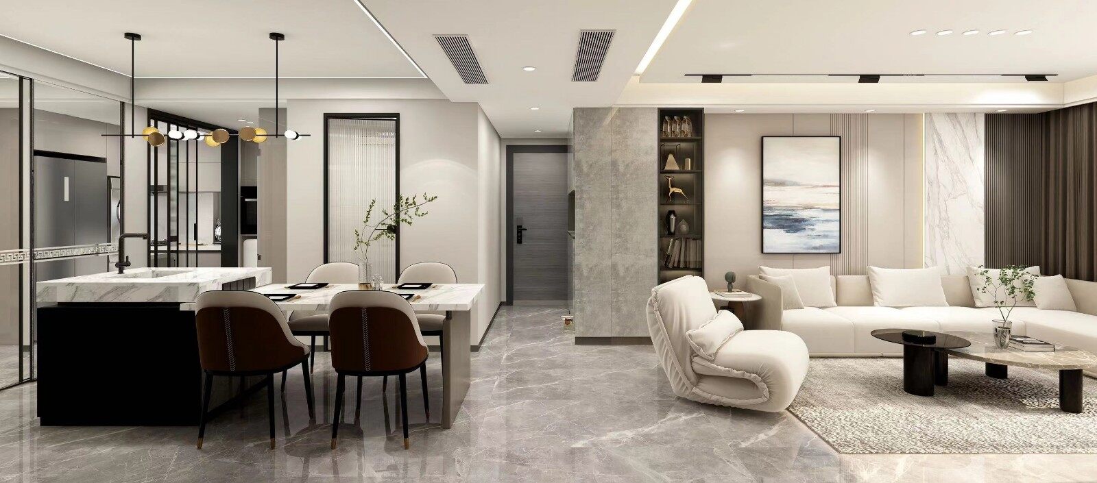 客厅作为整个空间的重要区域,一定要有较强的设计感,本案根据业主的需求增加入户储存区域,因业主喜欢轻奢的质感,中意岩板的柜门,所以将这些元素植入其中。