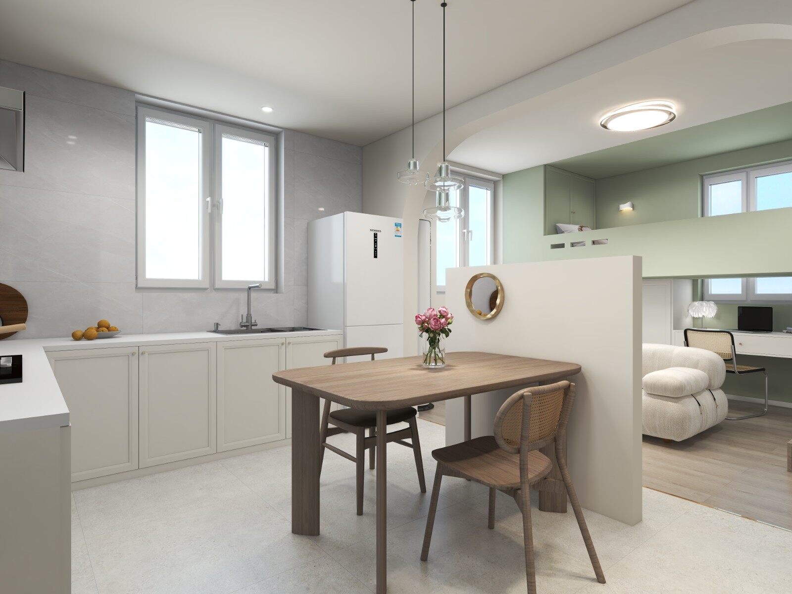 打破原有的空间寂静,LDK一体,加强餐厅厨房一体化,拓展餐厅功能,使生活烟火气溢满全屋。