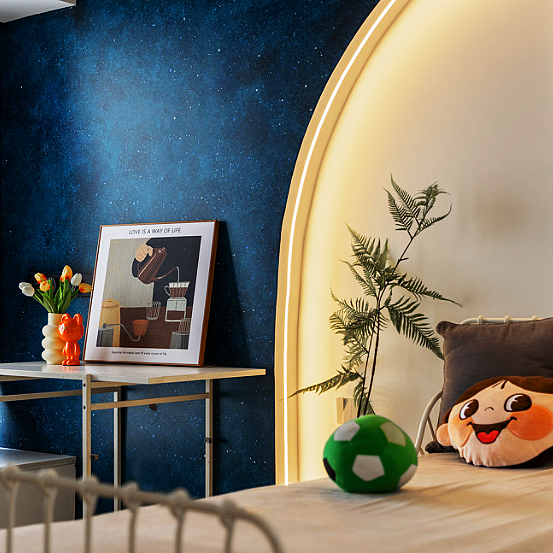 小男孩对蓝色总是有莫名的偏爱,房间选用星空为主题,刷了满墙属于他的夜间宇宙。探索与童趣伴他成长。