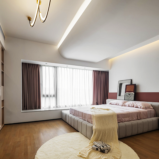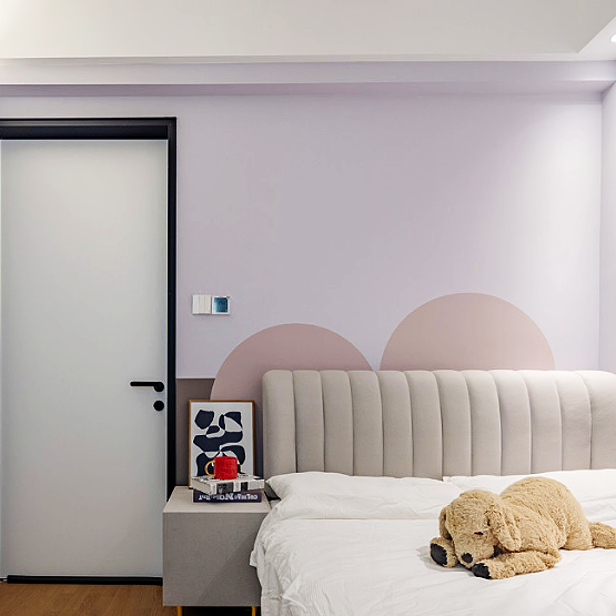 超大飘窗采光更充足, 床头背景墙延续,客餐厅粉粉的色调。