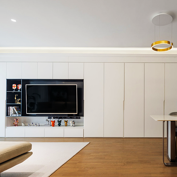 置物柜从玄关延续至客厅,既解决收纳问题, 亦打造了多功能电视背景墙。