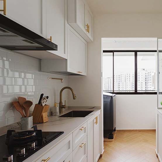 厨房空间有一个小阳台,我们将其独立起来,做成洗衣房使用,晾衣洗衣方便自如,还能将室外采光引入到厨房,保证空间采光性。