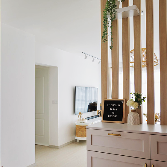原始的空间是一个换鞋凳+深色格栅,空间没有地方存放鞋子,因此会导致入户第一眼空间的杂乱,所以我们考虑到屋主的生活需求和习惯,在户型结构上没做改变,玄关处增加了收纳柜,解决了入户门空间的储物问题,一进门就能拥有好的心情。