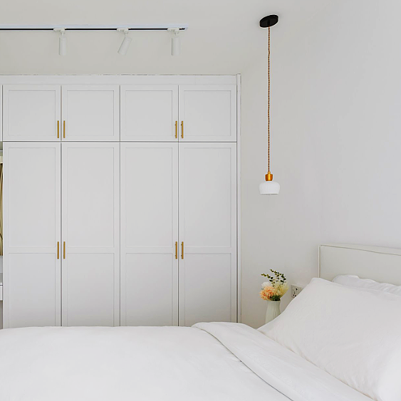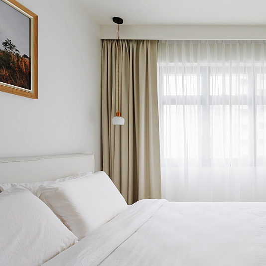 卧室空间以白色为主,空间整体呈现出简洁的视觉感,主卧的采光比较好,因此在窗帘的选择上是奶油色+纱帘,天气好的时候光影也是透过纱帘营造出若隐若现的美感。