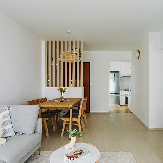 色原木格栅的设计是起到一定的隔断作用,避免一眼望到客厅空间,没有隐私性,因此增设的隔断让空间呈现出若隐若现的朦胧感,也能起到一定的功能分区效果。