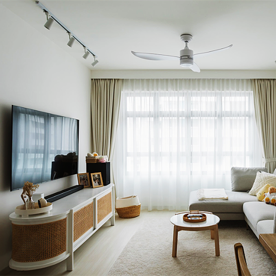 由于空间墙面大面积白色乳胶漆为主,考虑到空间问题,在家居的选择上以简约为主,电视柜没有用超大的柜体,而是选择小巧又能装的藤编电视柜,与整个空间形成统一感。