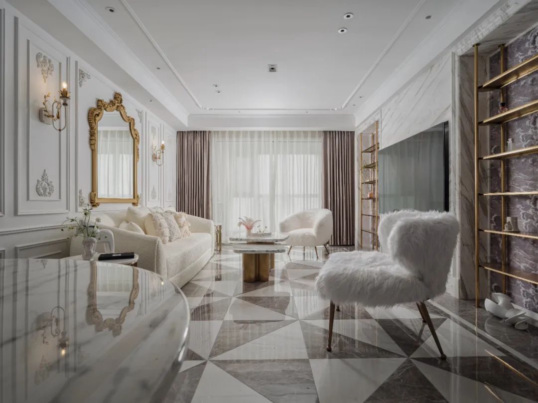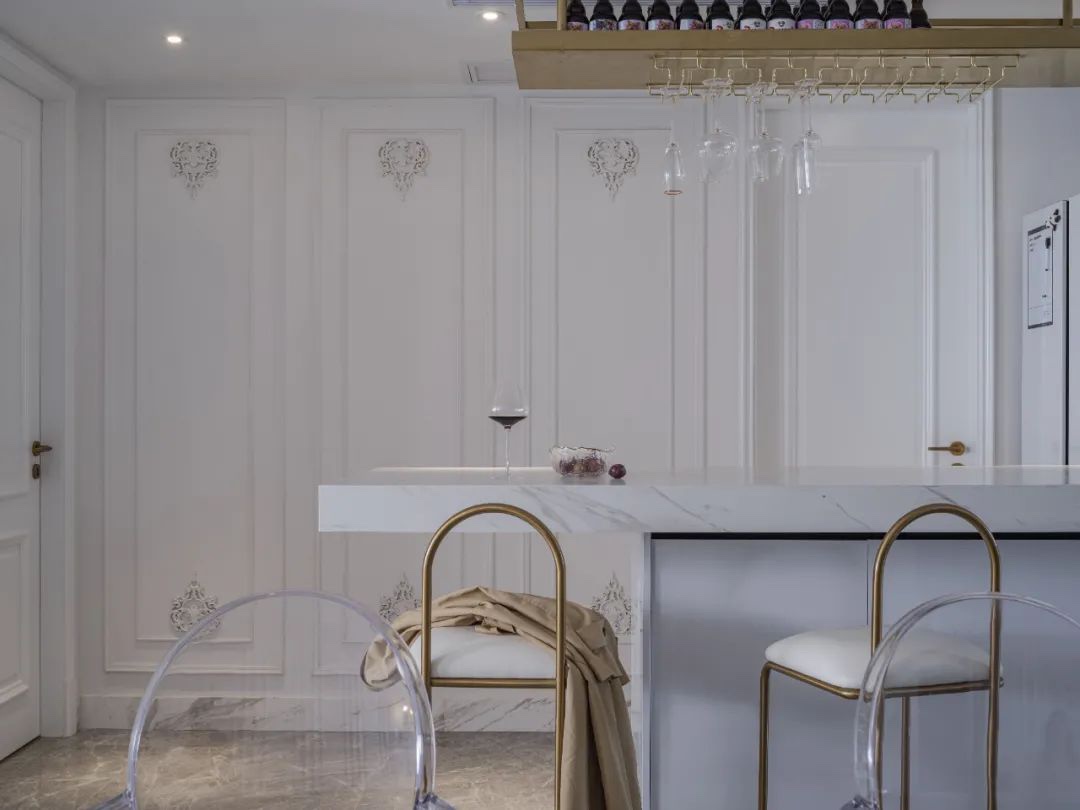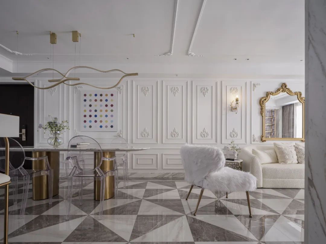 金属和石材的配合略显奢华,搭配艺术感吊顶和透明的餐椅。