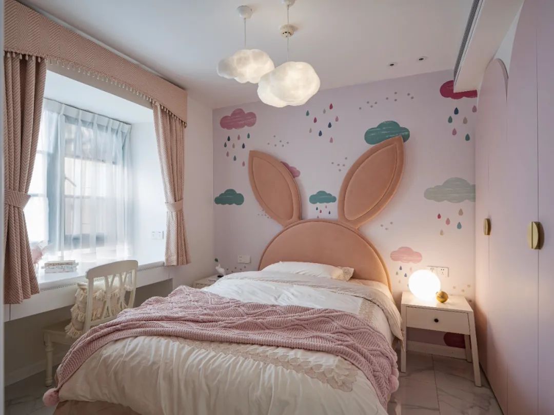 儿童房软装定制了一个床背超大的兔子床,大大的床背格外好看,搭配粉嫩的柜门,靠近床头柜的柜门做了分段,不用担心开柜门的问题,床头柜将一直脚做成斜的,可可爱爱!