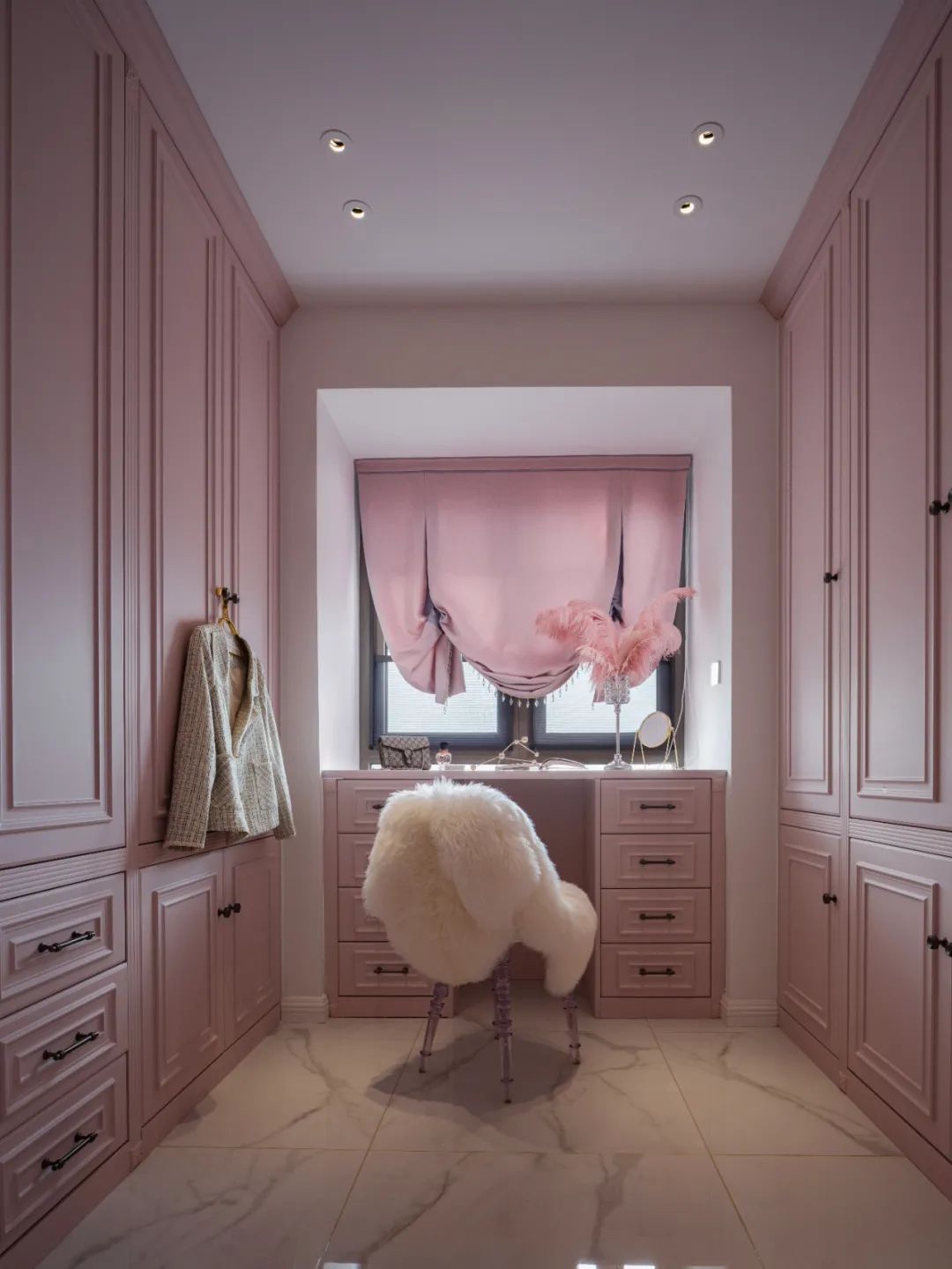这一间房兼顾了衣帽间和客房两个空间需求,平时是一个粉嫩的衣帽间,用一排柜子暗藏了嵌入式的床,满足客人来可能会留宿的需求,平时看不到床,空间显得更为简洁!