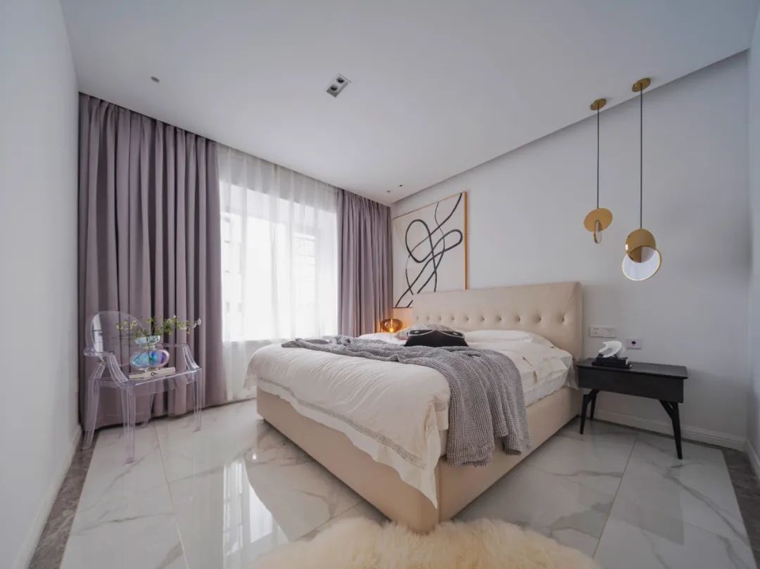 主卧按照男主人的喜好更为中性,床选择有一定厚度的靠背方便使用移动投影,对面的大白墙也是为投影准备,房间的挂画是美女业主本人画的,家里添加一些有主人气息的画作,空间更为生动!