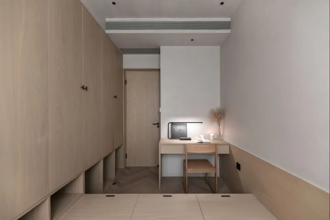 次卧室木饰面包裹的榻榻米带来空间秩序感,同时弱化了柜子本身收纳的繁琐。去掉多余的装饰,让光线能充分地照入室内,增加了空间的通透度,同时也为孩子营造出一个很舒服自然的成长空间。木地板式推拉门 巧妙延伸视觉空间感