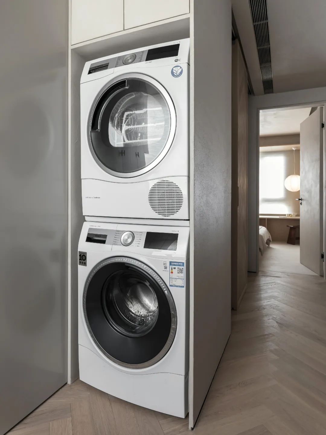 书房与洗衣房相结合,半透明的玻璃门与周边的木质材料形成对比,在区分书房与衣帽洗衣房的同时,也不会产生逼仄感。同时也有效将书房、衣帽洗衣房、卧室这三个空间,进行了有效地分隔,在极为有限的空间内,保证了各自的隐私性。