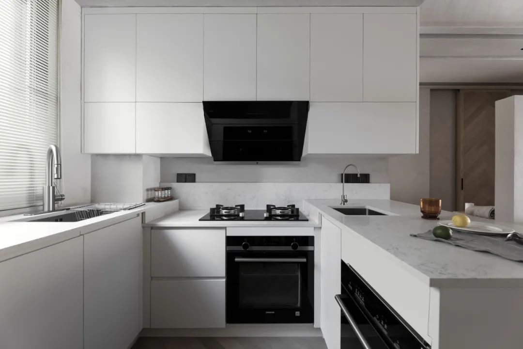 全白色的厨房实在太令人一见钟情啦~ U型操作台的模式,化利用了厨房的空间,吧台的半开放架收纳形式,让展露在外的瓶瓶罐罐意外变成一种装饰,为纯白色的空间增添了不少诱人的烟火气。 同时,白色可以限度的释放出照入厨房的光线,与客厅里的阳光相融,想象一下,沐浴着温暖的阳光,连料理都成为一种生活滋养~