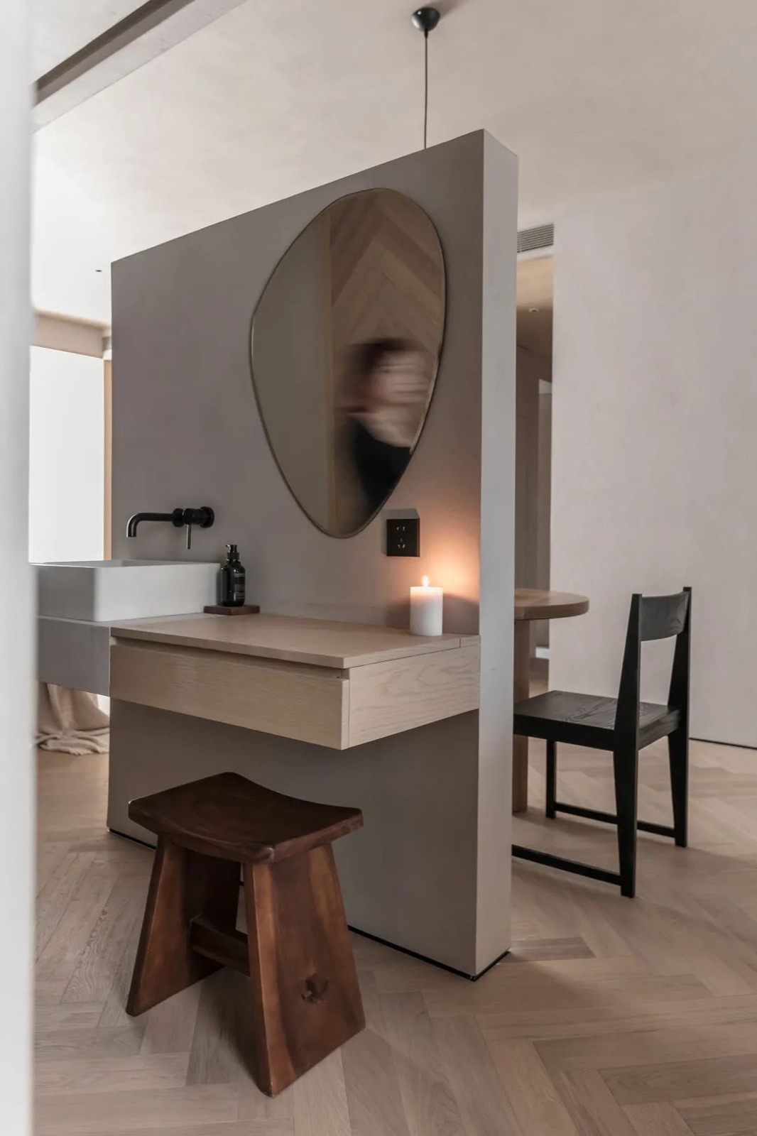 而另一侧是女主的梳妆台,整个设计都是尽可能将空间简化,突出材质和家具的主体性,在回归生活功能性的同时,更是毫不费力地刻画出素朴的诗意之美。