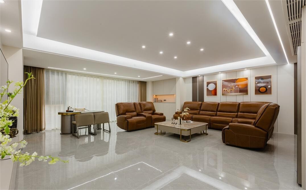 客餐厅一体设计,厅堂的空间感宽敞又明亮。会客区域天花板无主灯设计,用悬浮式吊顶,营造空间层次感,让厅堂的氛围隆重华丽。