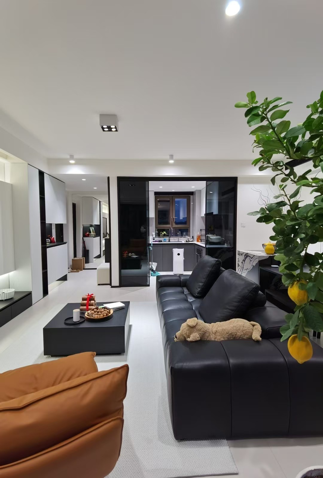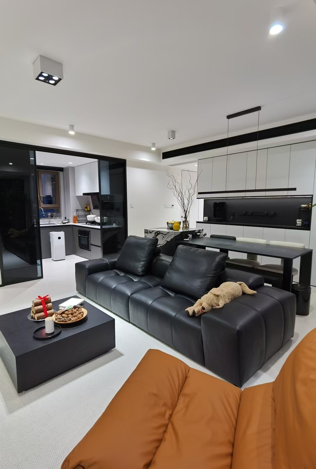 ? 色调搭配:以黑白灰为主色调,奠定简洁大气基调。黑色的皮质沙发、厨房边框与柜体,沉稳内敛;白色的墙面与柜体,明亮纯净;灰色的地面与厨房部分柜体,增添质感层次。橙色单椅作为点缀色,为空间注入活力与温暖。