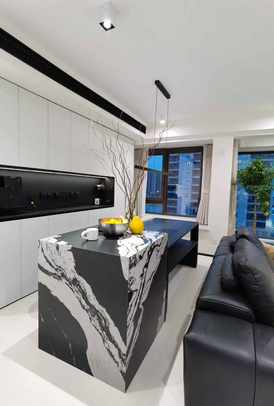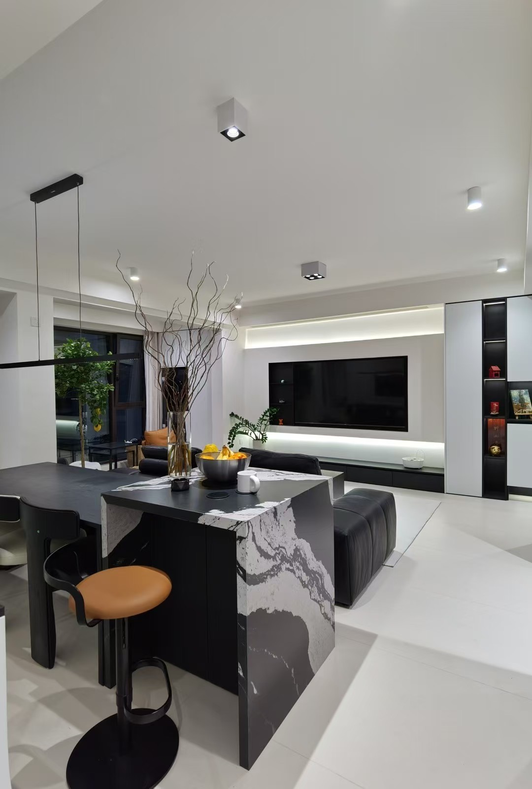 ? 餐桌设计:黑色餐桌搭配同色系长凳与橙色吧台椅,色彩协调且富有变化。餐桌中岛台一体设计,中岛台采用黑白纹理大理石材质,质感高级,台面上摆放水果、枯枝装饰,增添生活气息。