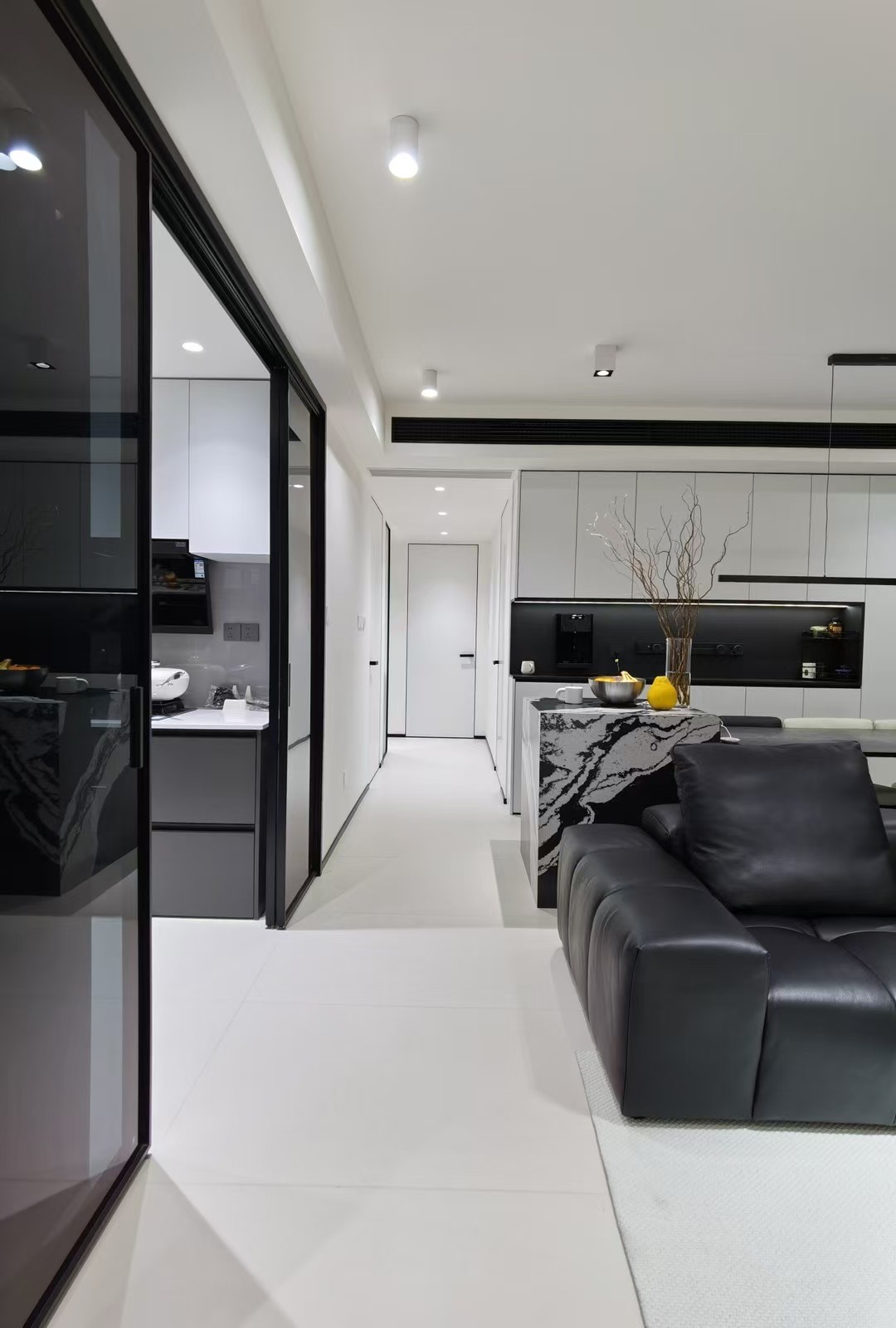 ? 橱柜设计:整体橱柜以黑白灰三色为主,白色柜门搭配黑色把手与灰色台面,简洁利落。玻璃推拉门既阻隔油烟,又不影响空间通透感。