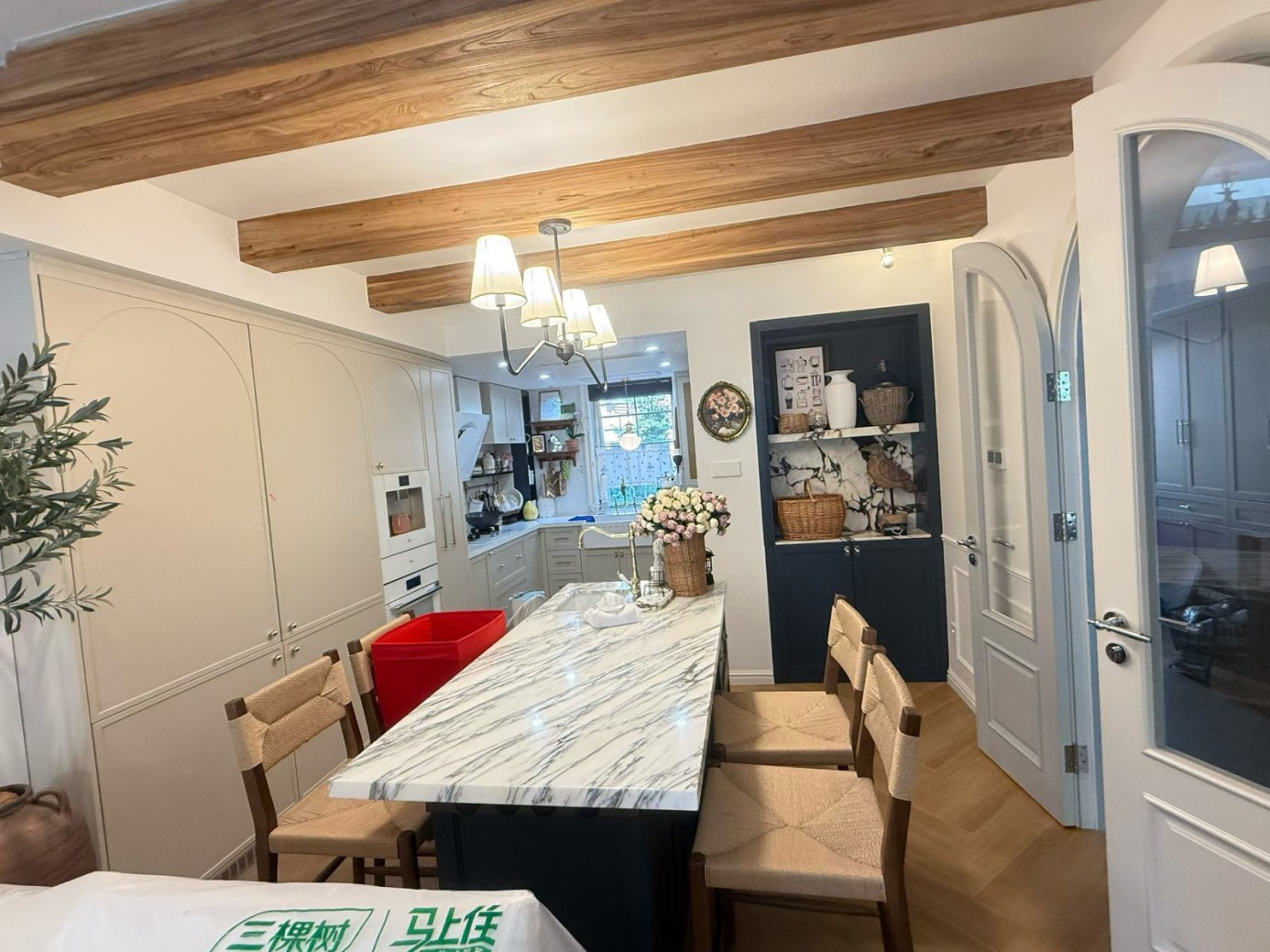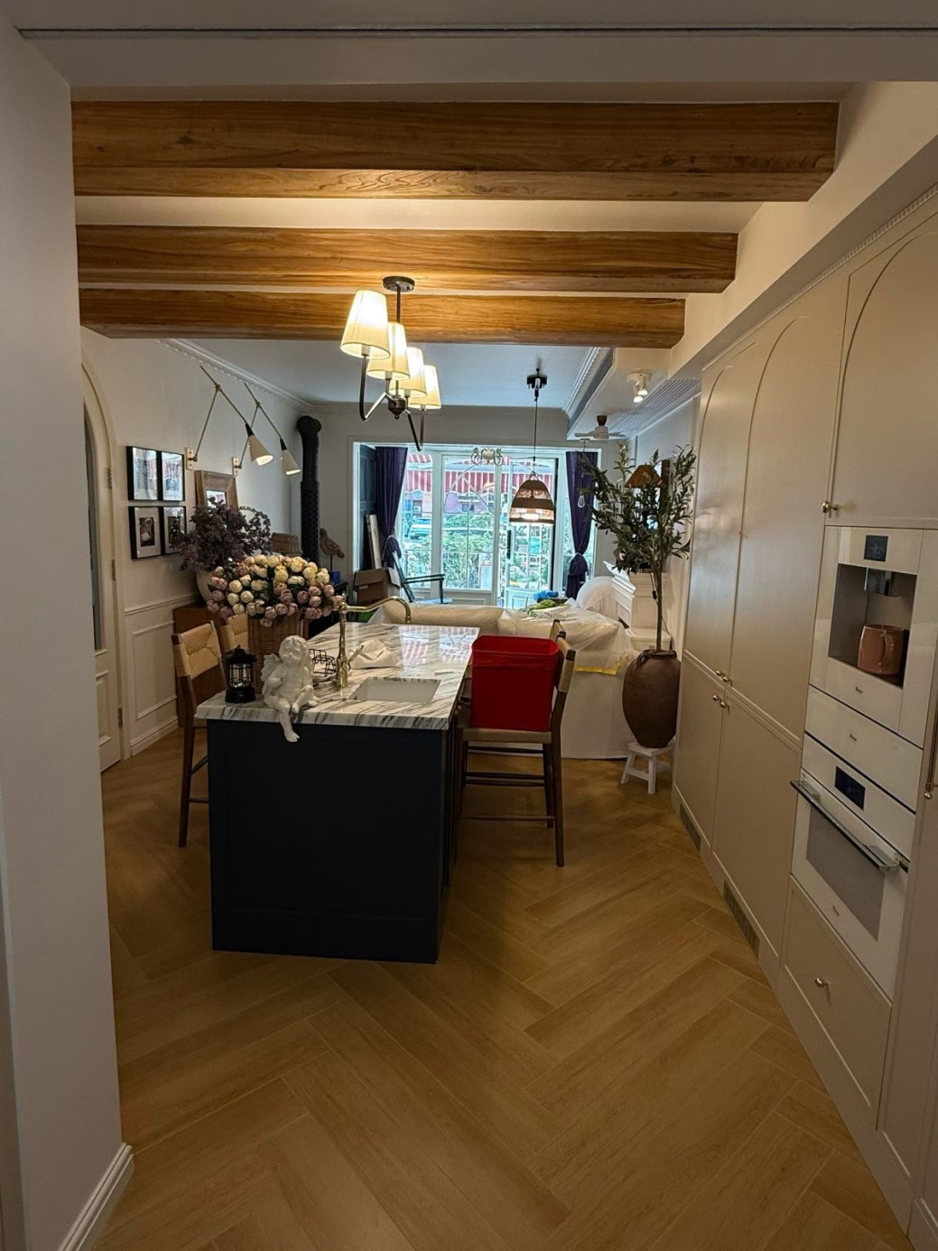 这套房子主要是母女俩居住。女儿是在国外留学,也特别喜欢法式的风情,所以这套房子的装修以女儿的审美和喜好为主来打造。 女儿在国外留学其间,深受当地开放、互动、多元文化的吸引,也特别喜欢开放式厨房,所以在设计上特别注重打开厨房的格局,加强厨房和餐厅、客厅之间的联通。 另外卧室内的绿色大浴缸是妈妈的钟爱,在卧室放一个浴缸的思路也是非常的特别,整体的家居风格很有调性