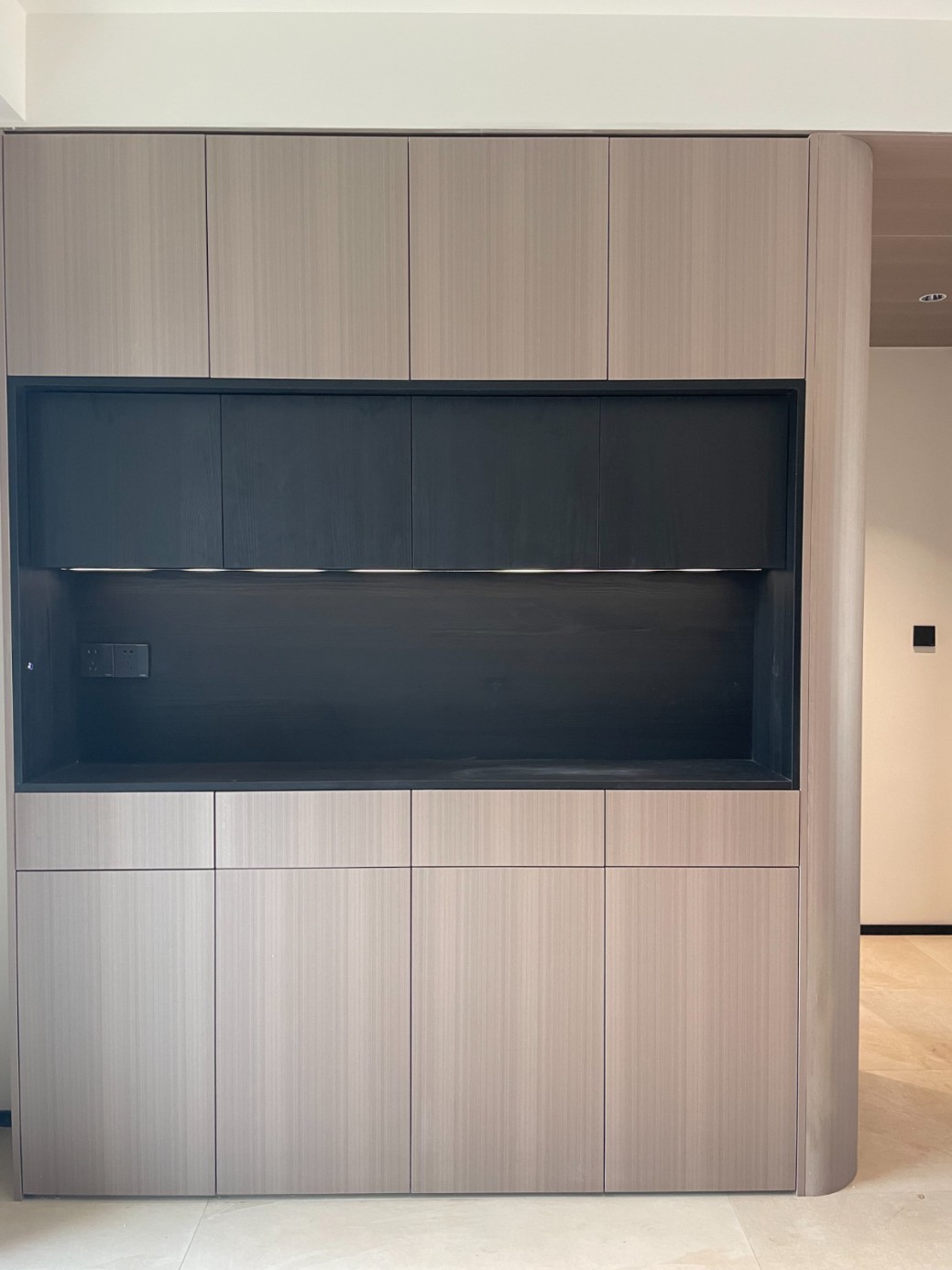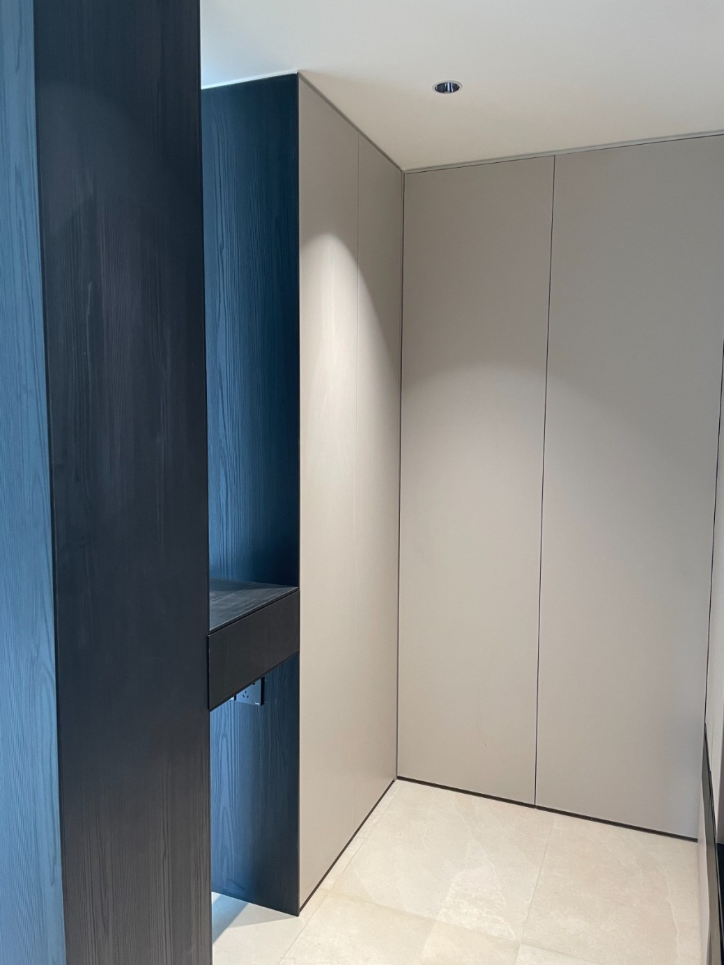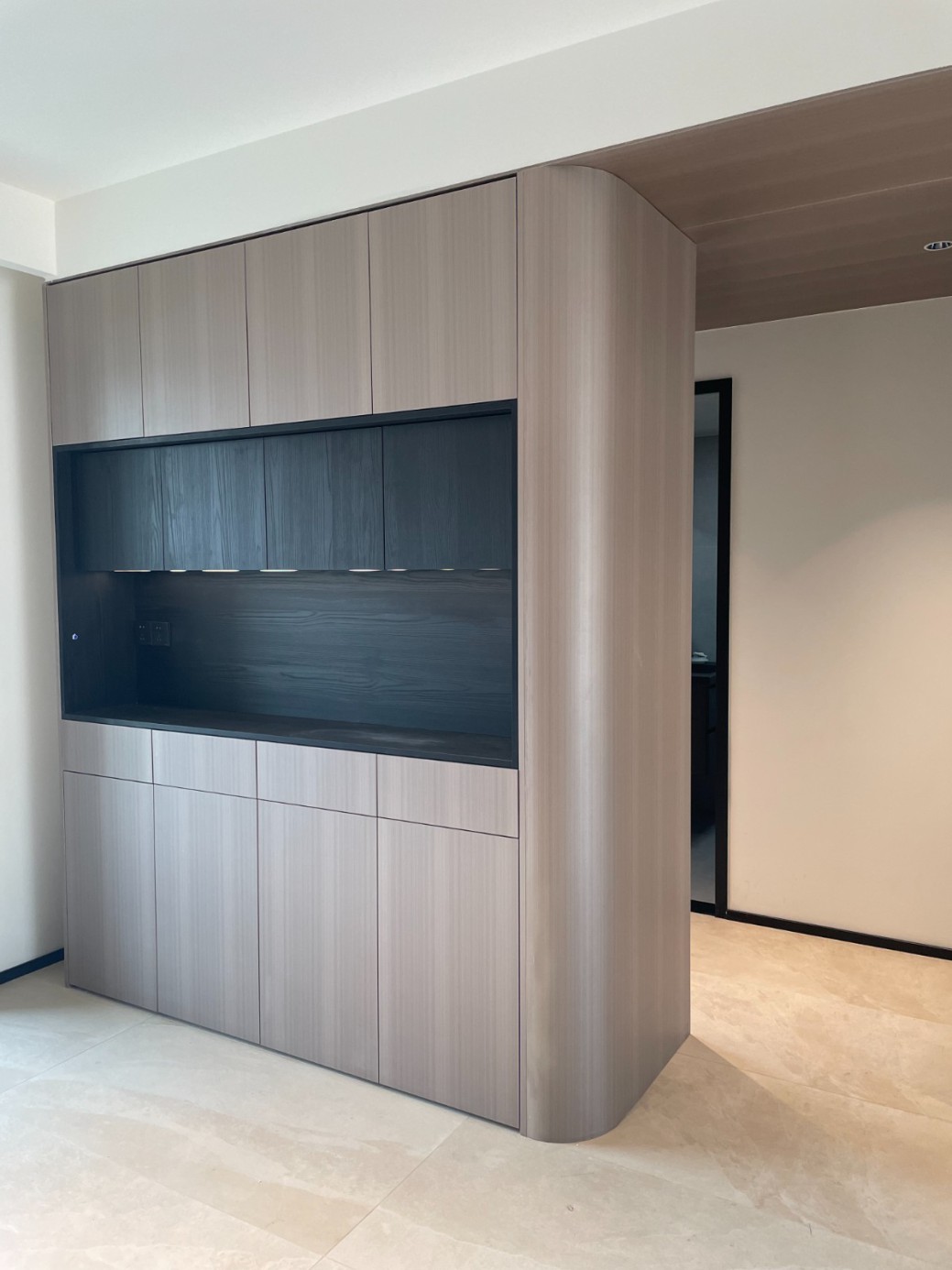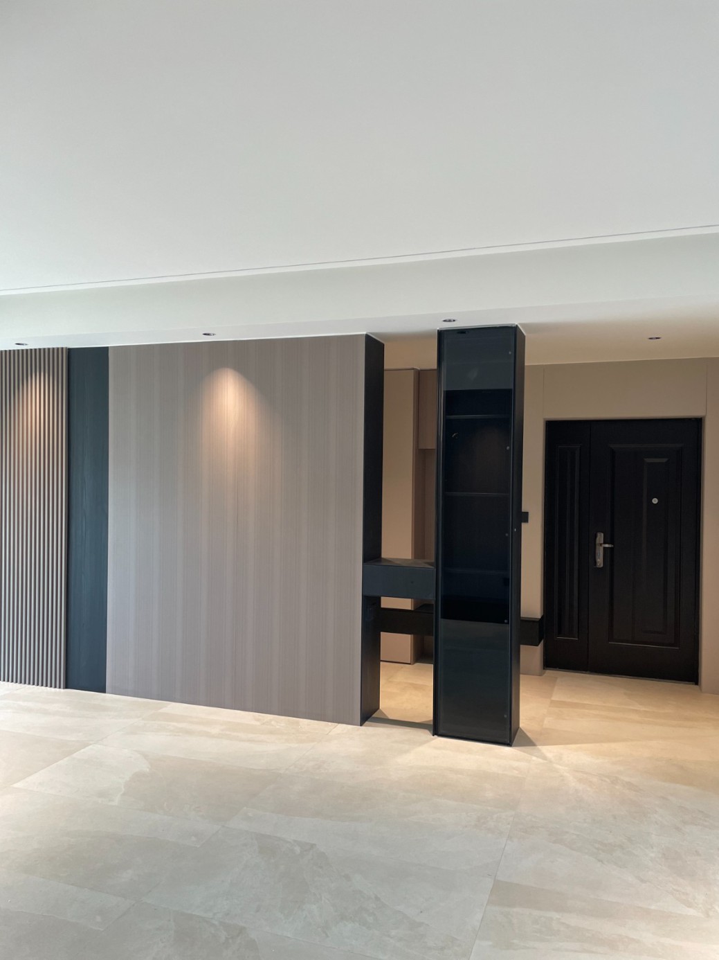 现代极简风的全屋定制设计,整体以低饱和度的深灰与浅灰为主色调,通过简洁利落的直线条、无多余装饰的柜体造型,营造出冷静克制的空间氛围。墙面竖纹肌理与同色系定制隔断柜形成呼应,弱化了柜体的厚重感,同时利用嵌入式灯光提升空间层次与精致度,既满足了空间分隔与收纳功能,又最大化保留了通透感,完美契合现代家居对简约、实用与高级质感的追求。