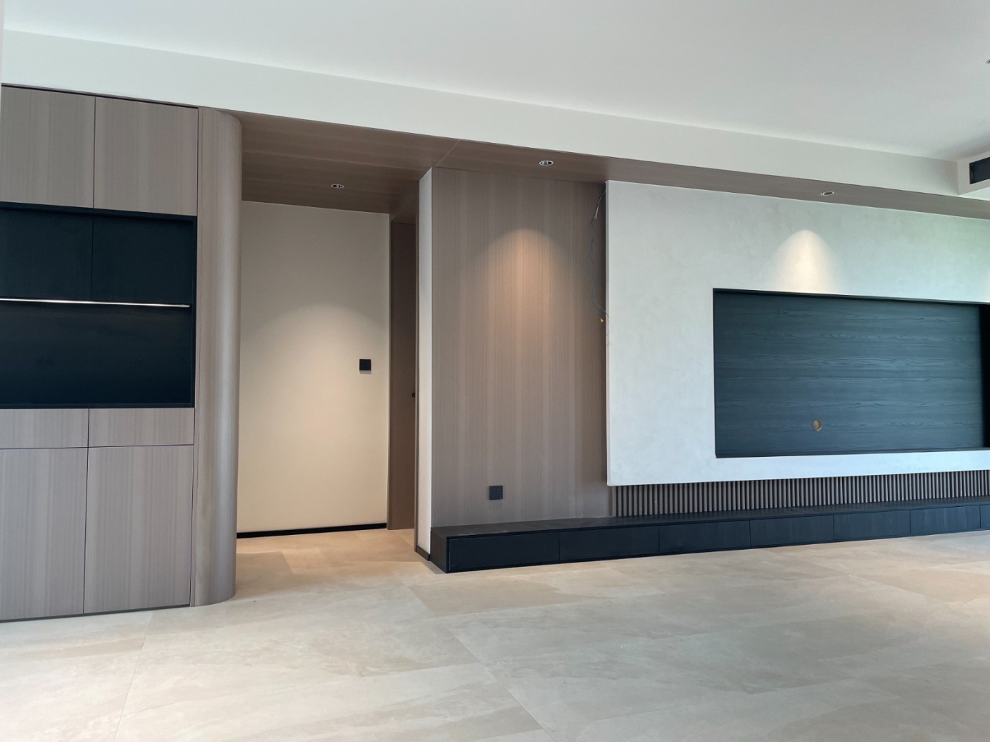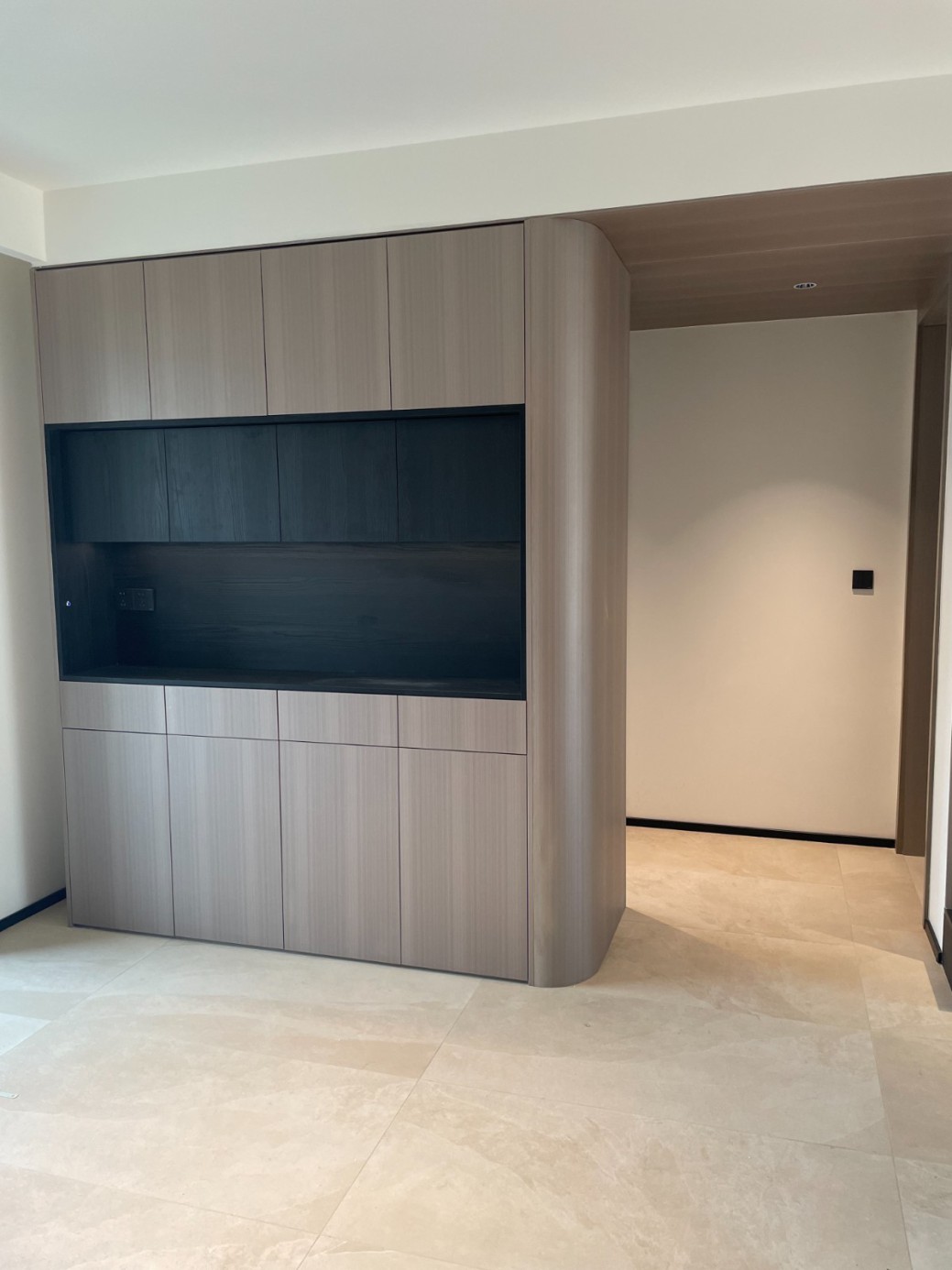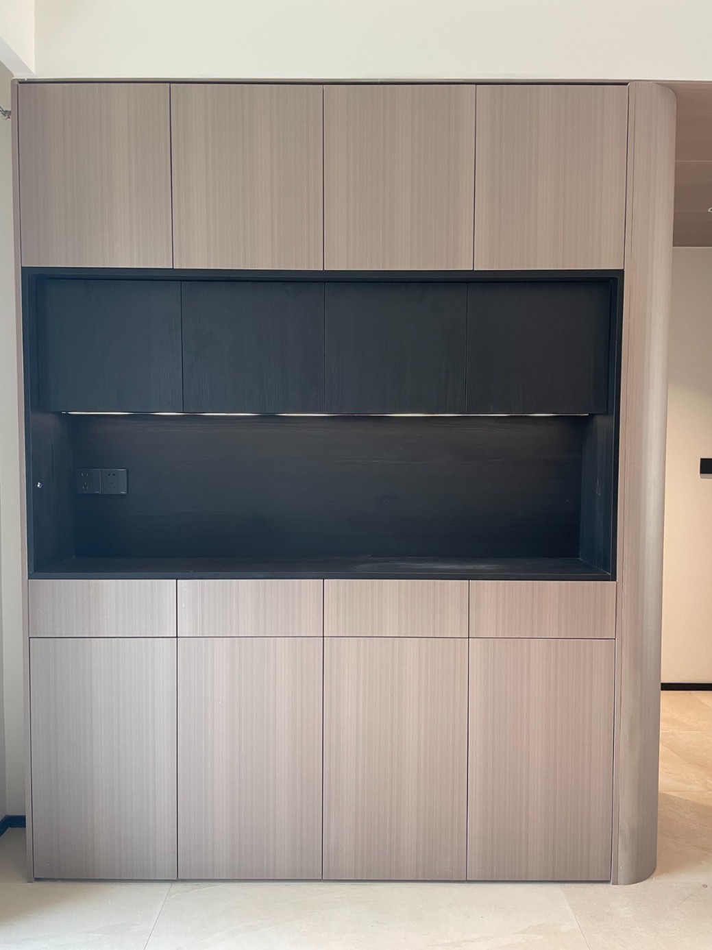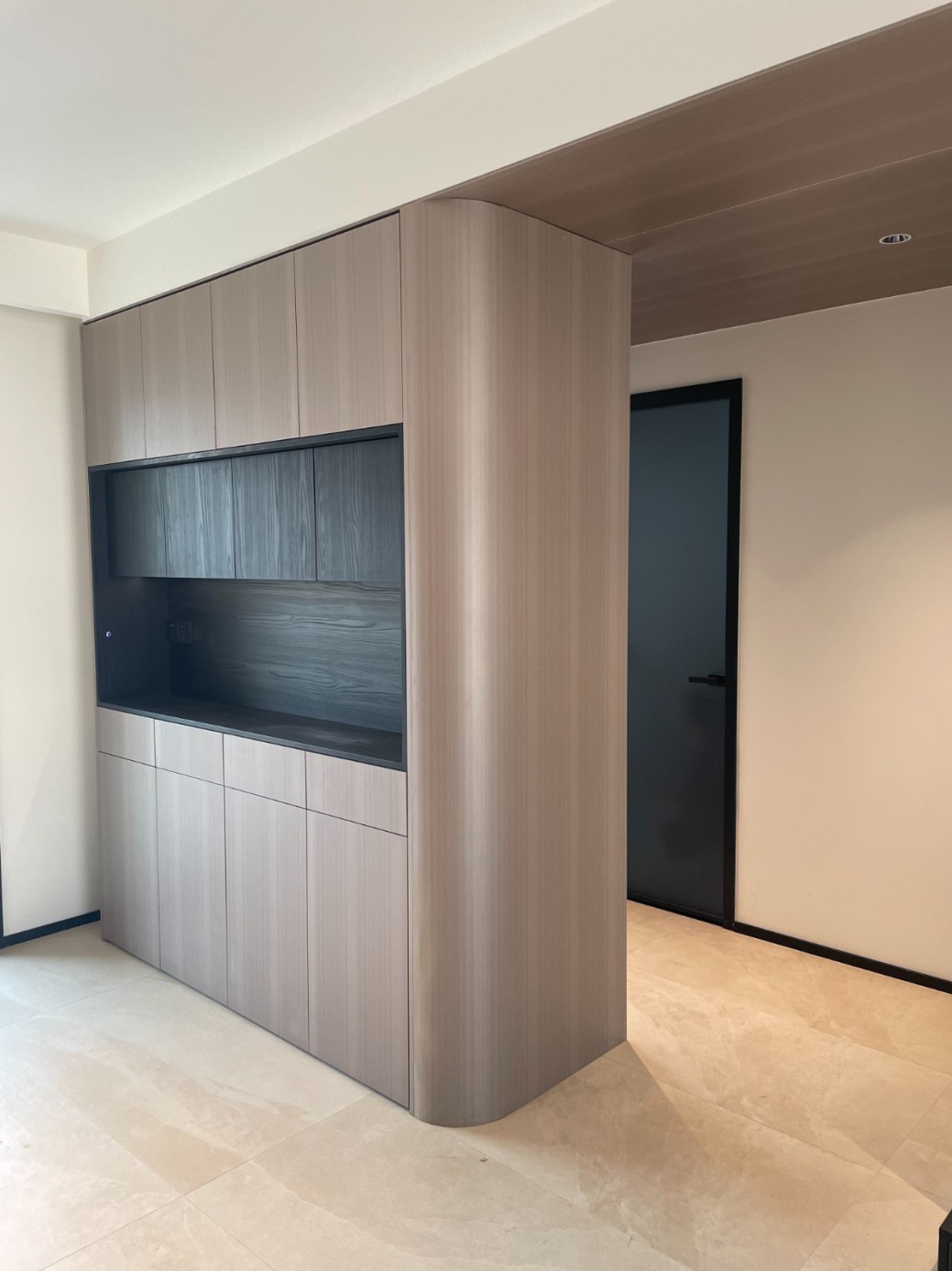现代极简风的全屋定制设计,整体以低饱和度的深灰与浅灰为主色调,通过简洁利落的直线条、无多余装饰的柜体造型,营造出冷静克制的空间氛围。墙面竖纹肌理与同色系定制隔断柜形成呼应,弱化了柜体的厚重感,同时利用嵌入式灯光提升空间层次与精致度,既满足了空间分隔与收纳功能,又最大化保留了通透感,完美契合现代家居对简约、实用与高级质感的追求。