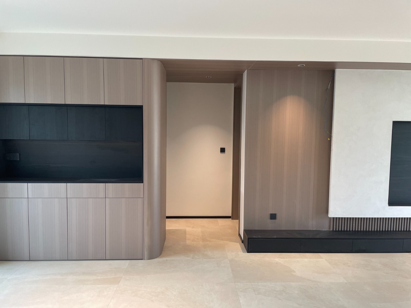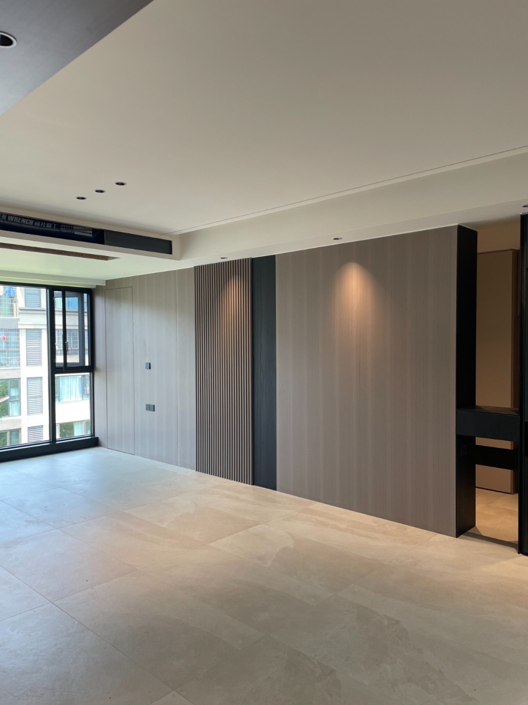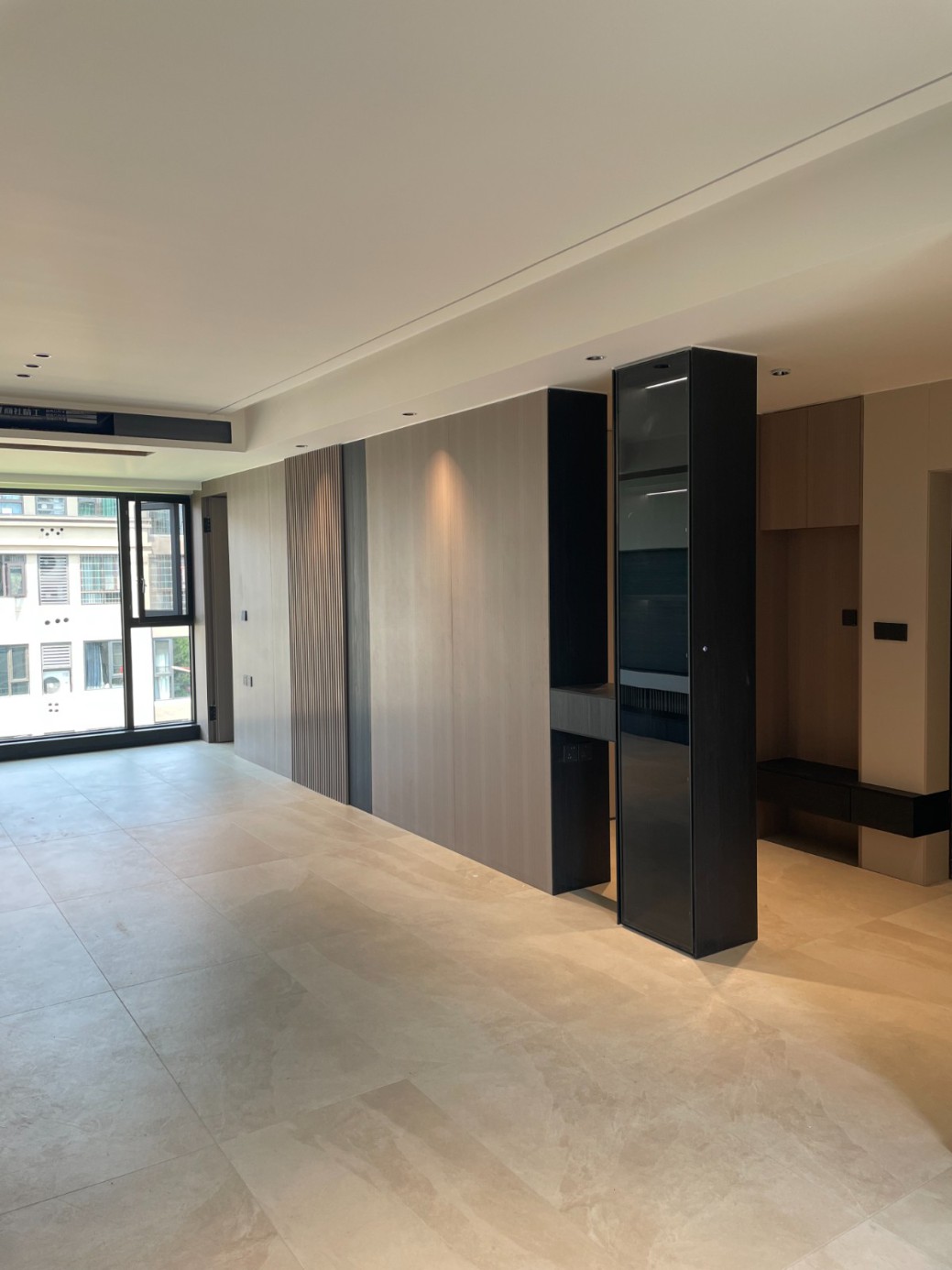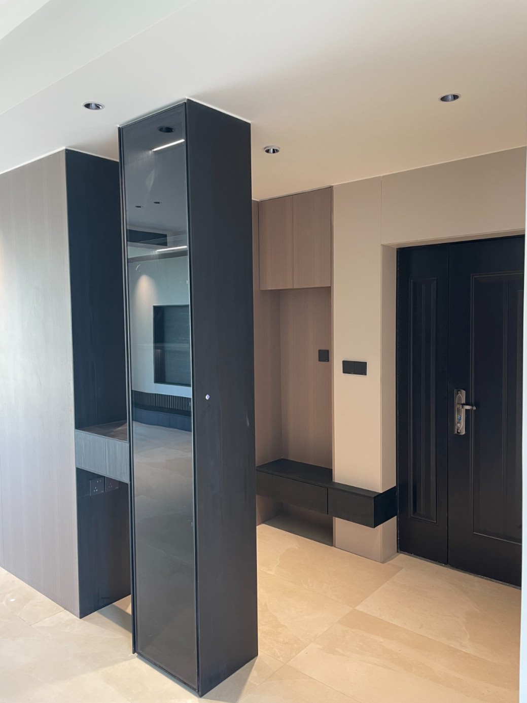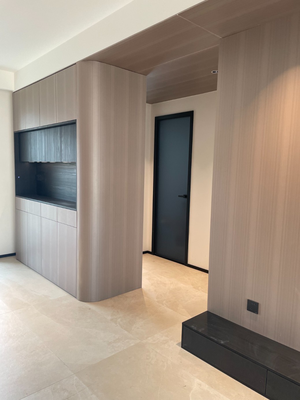 现代极简风的全屋定制设计,整体以低饱和度的深灰与浅灰为主色调,通过简洁利落的直线条、无多余装饰的柜体造型,营造出冷静克制的空间氛围。墙面竖纹肌理与同色系定制隔断柜形成呼应,弱化了柜体的厚重感,同时利用嵌入式灯光提升空间层次与精致度,既满足了空间分隔与收纳功能,又最大化保留了通透感,完美契合现代家居对简约、实用与高级质感的追求。