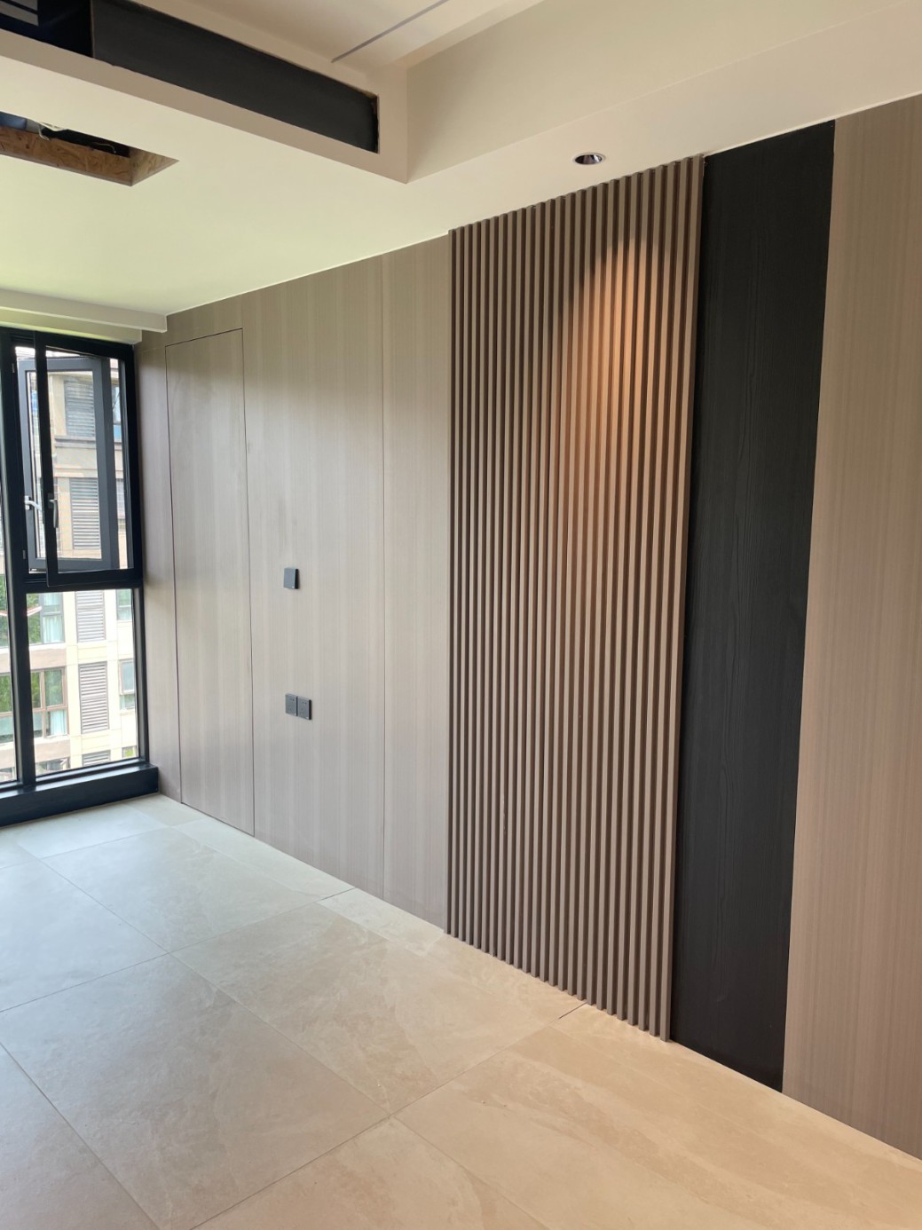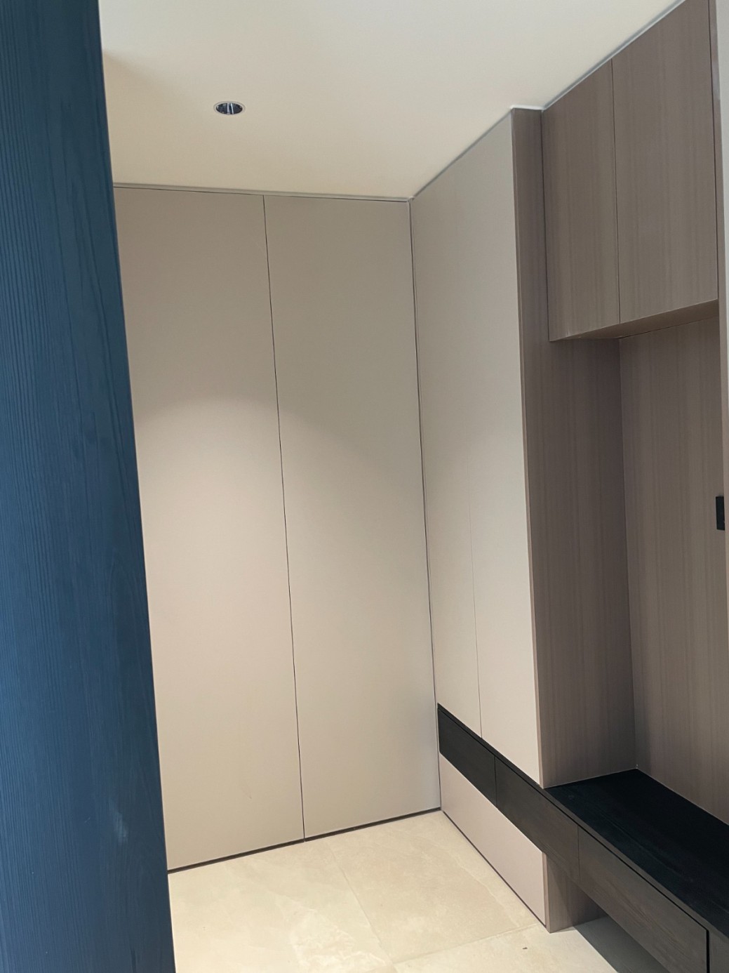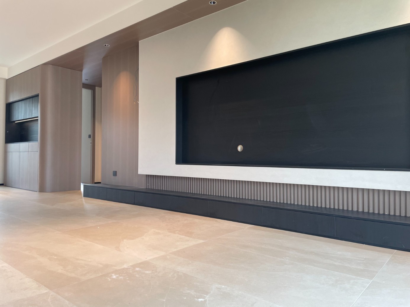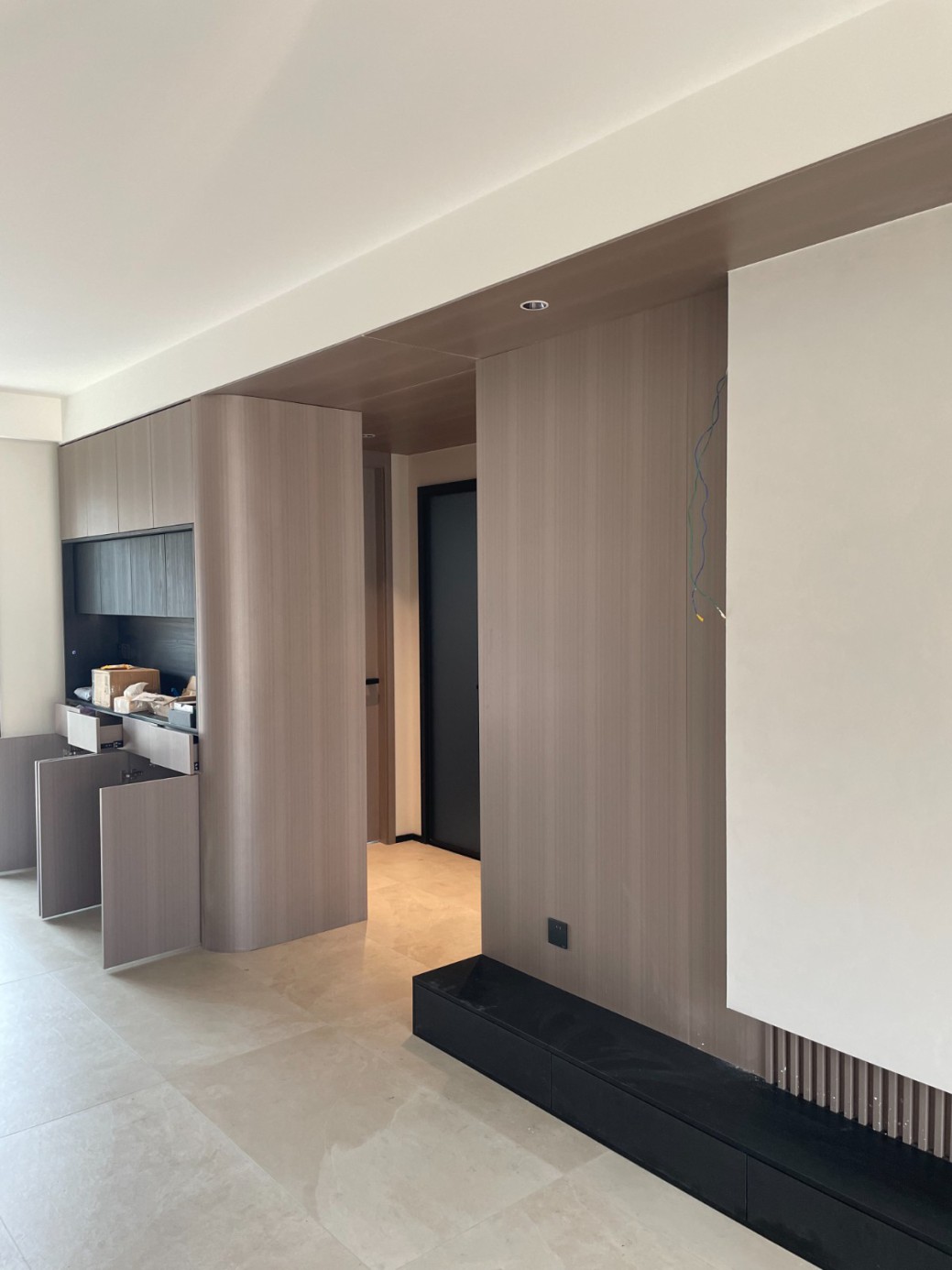 现代极简风的全屋定制设计,整体以低饱和度的深灰与浅灰为主色调,通过简洁利落的直线条、无多余装饰的柜体造型,营造出冷静克制的空间氛围。墙面竖纹肌理与同色系定制隔断柜形成呼应,弱化了柜体的厚重感,同时利用嵌入式灯光提升空间层次与精致度,既满足了空间分隔与收纳功能,又最大化保留了通透感,完美契合现代家居对简约、实用与高级质感的追求。